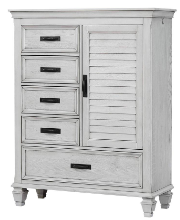Exquisite detailing and versatile storage options make this wooden man’s chest a fashionable and functional choice.Inspired by island resort style, this chest pulls out all the stops to provide convenience storage space.A generous array of drawers and an expansive cabinet easily accommodate any wardrobe.Self-closing drawers and door hinges offer smooth, easy use.Wire-brushed detailing in your choice of finishes adds rustic appeal to this gorgeous piece. SKU: 205338 NAME : Franco 5-Drawer Man’s Chest Antique White