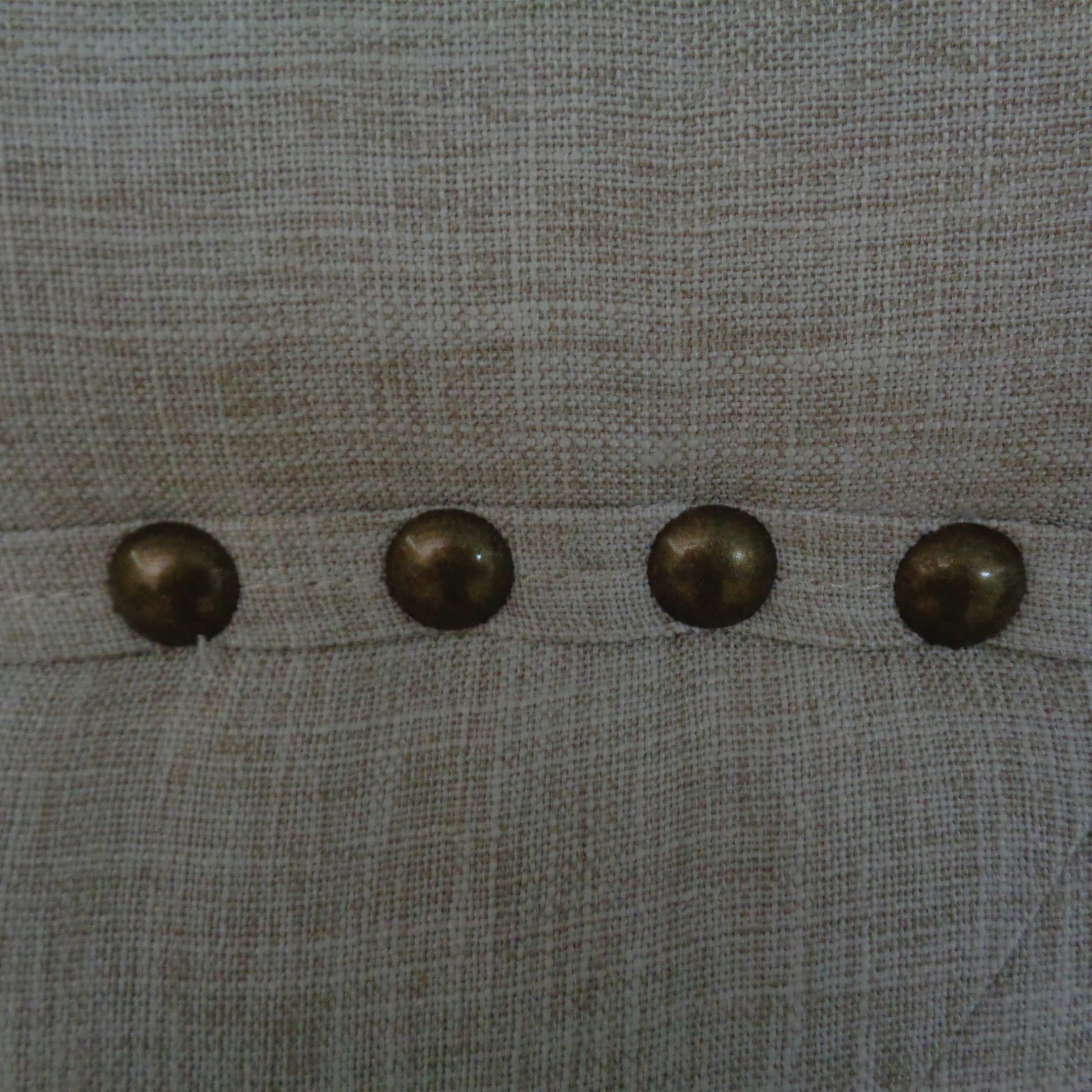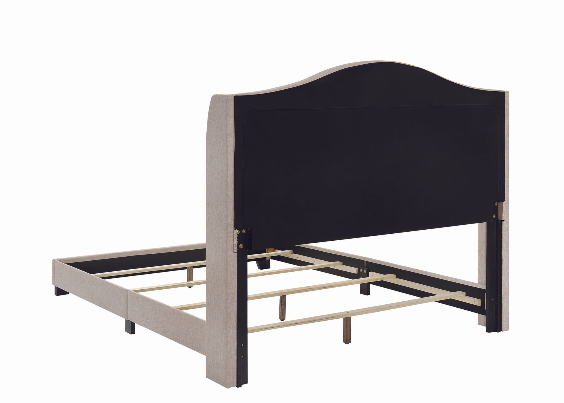 A tall and imposing headboard ups the drama factor for this Sonoma upholstered bed. Beautiful linen-like fabric wraps the headboard, rails, and low-profile foot rail to create a composed look. The headboard features a camelback profile that softens its silhouette. Button tufting is presented in multiple horizontal rows, adding texture and depth. Nailhead trim is a wonderful, classic finishing touch. SKU: 310073Q NAME : Sonoma Camel Back Queen Bed Beige