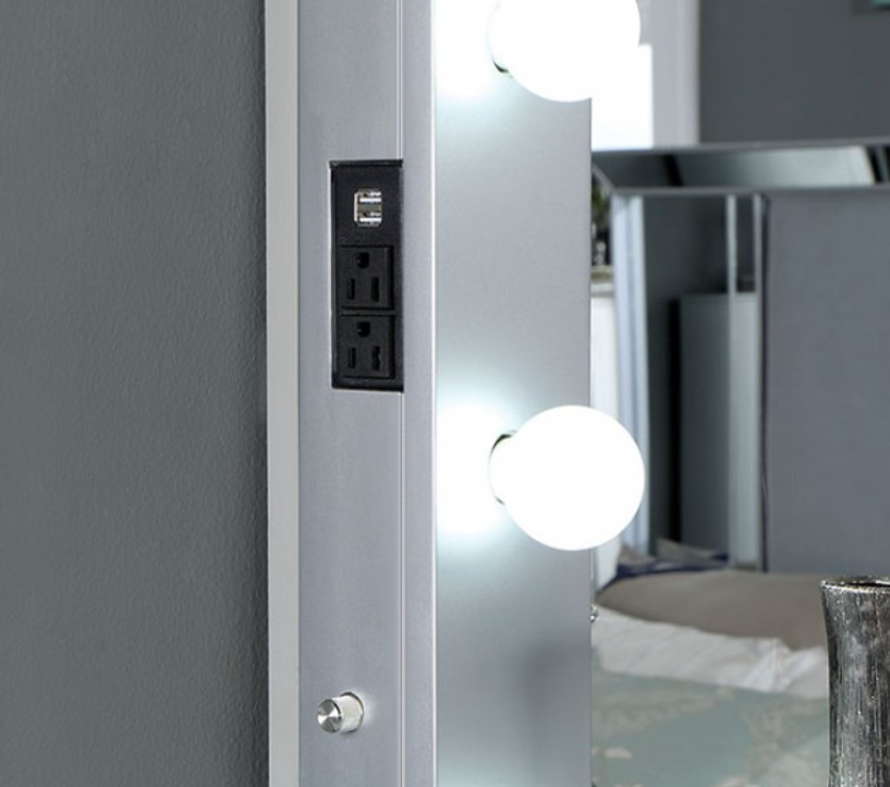 Glam hardly goes out of style. Large bulbs line the mirror allowing its use as a vanity, doubling down on that celebrity motif.