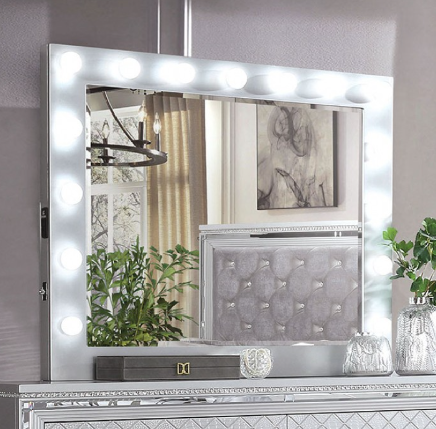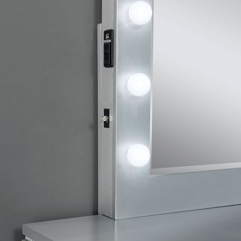 Talking about taking glam to the next level! Straight lines and simple silhouettes are reminiscent of the modern era, but the stunning details bring it up a notch. This matching vanity mirror is lined with large bulbs that will softly illuminate any Hollywood-inspired room.