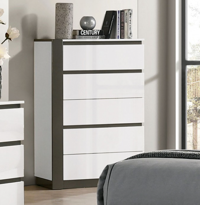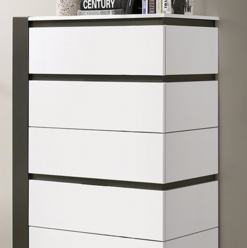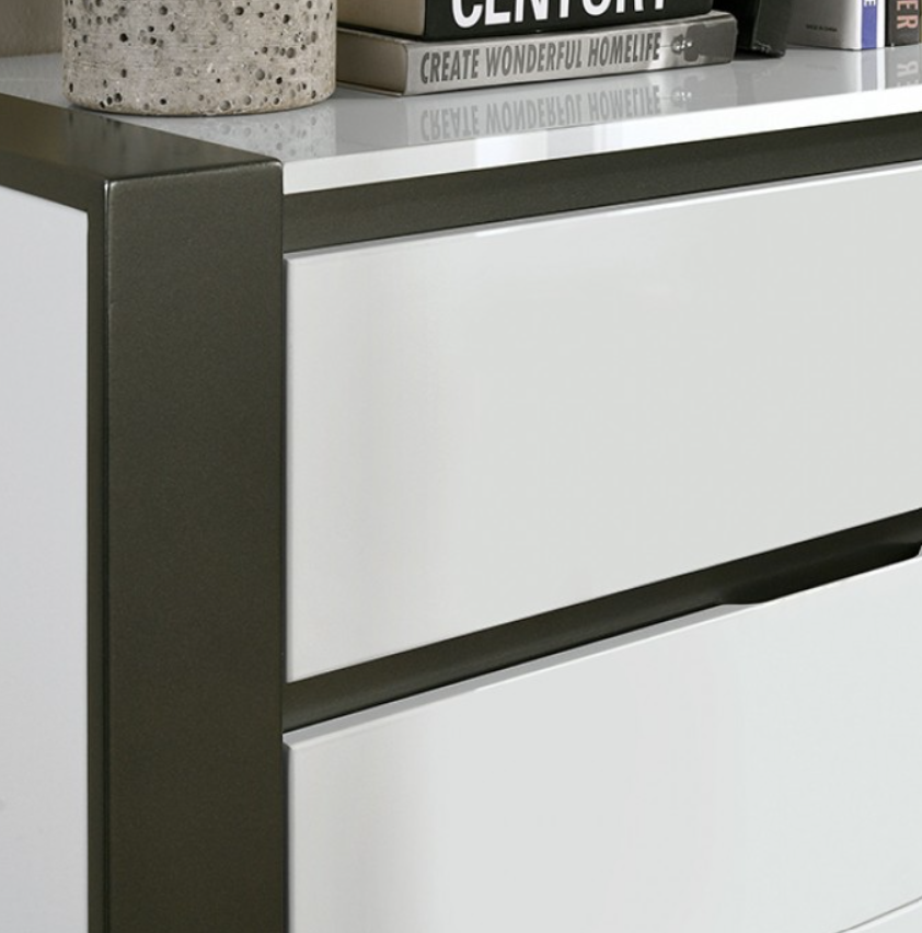 Just one look, and there is no doubt where this chest belongs--in a modern home. For starters, a striking two-tone design is produced by allowing large blocks of high gloss white to be interrupted by dark, metallic gray gaps. The panels all feature this bold color contrast. True to modern pieces, drawer handles are out of sight, as the gaps serve as concealed pulls as well. Look closer, and you'll notice how the gaps themselves are not even in width; this purposeful asymmetry adds more to the appeal and modern vibe.