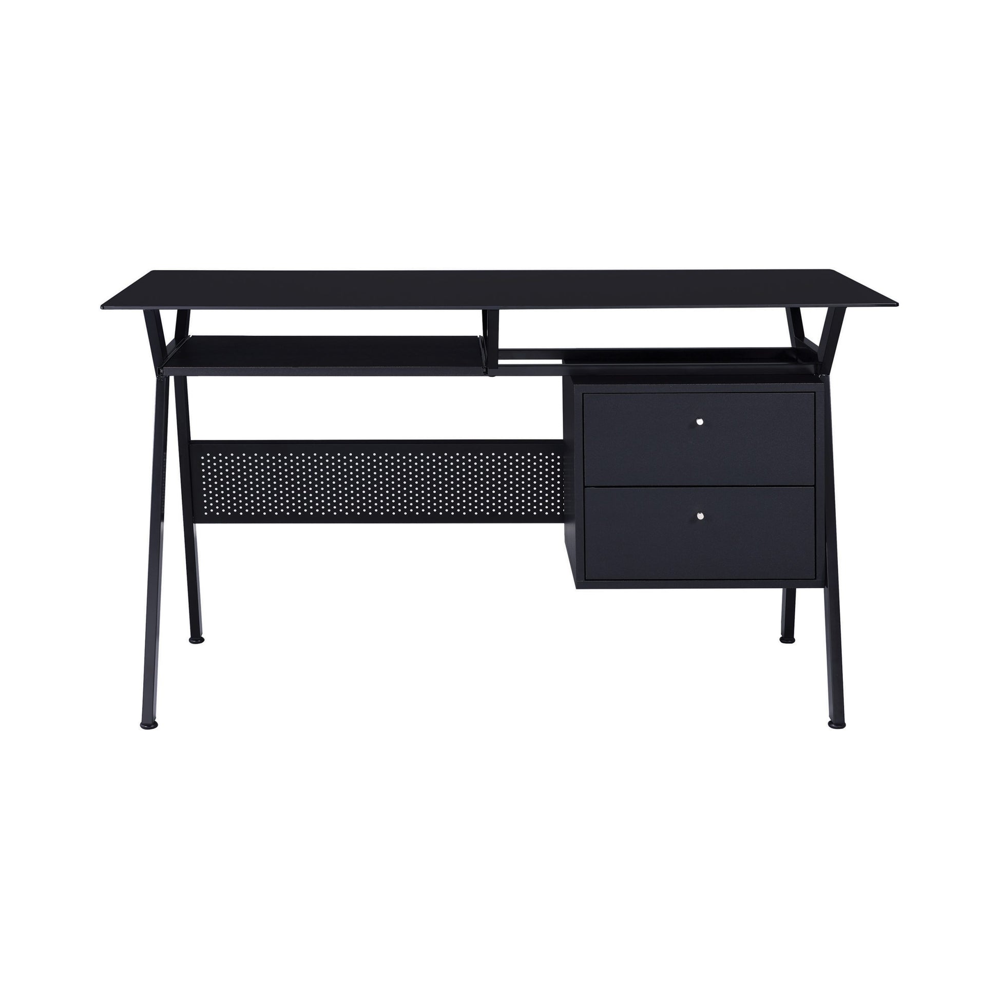 The sleek design of this computer desk adds a touch of taste and class to any workspace. Four supportive legs are elegantly curved to create an elegant silhouette. A black finish and black tempered glass top give it a pleasing, monochromatic look. Its three convenient drawers include a keyboard drawer with Euro glides. This desk is constructed from steel and other high-quality materials for strength and durability. SKU: 800436 NAME : Weaving 2-Drawer Computer Desk Black