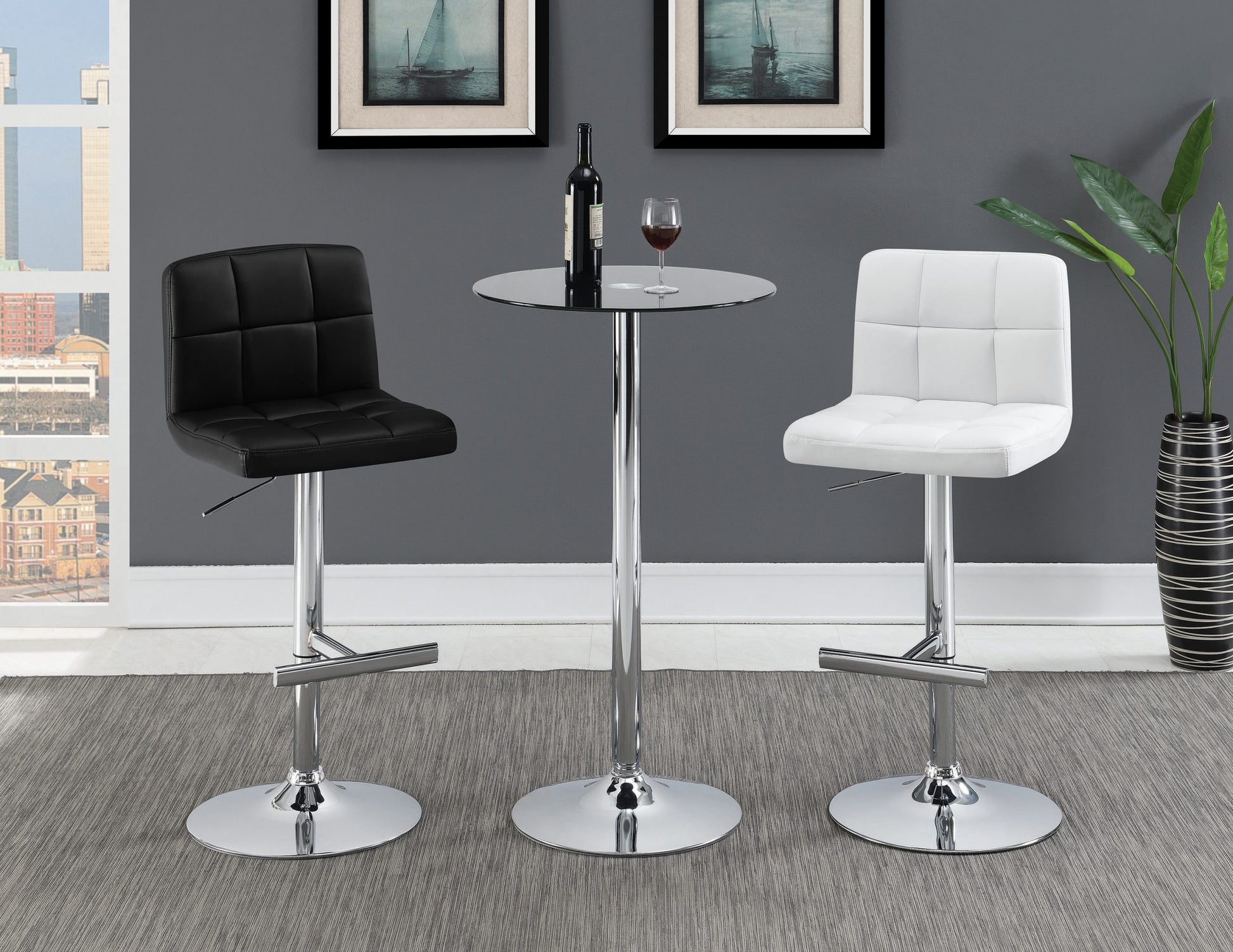 - Height adjustable hydraulic bar stool available in black and white leatherette