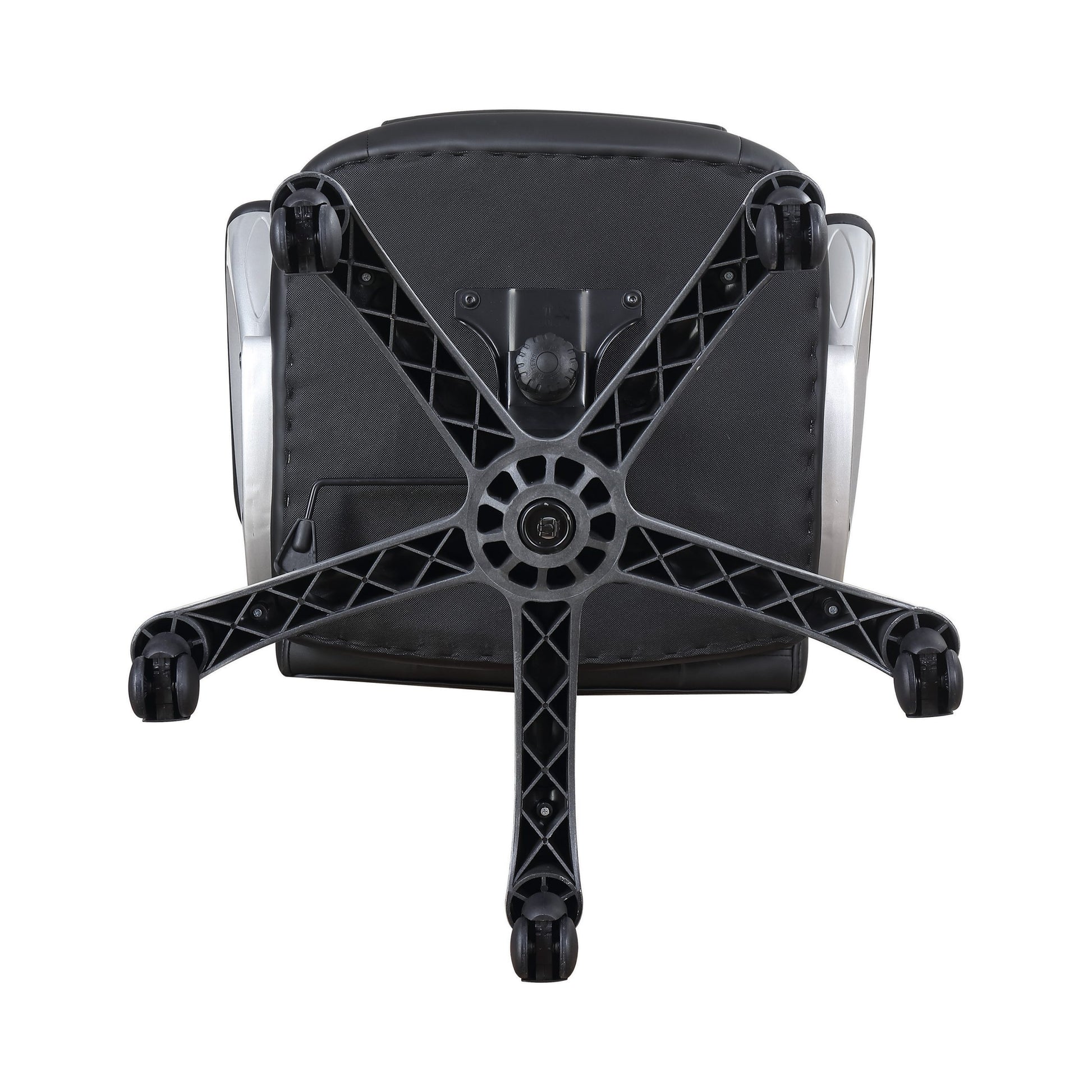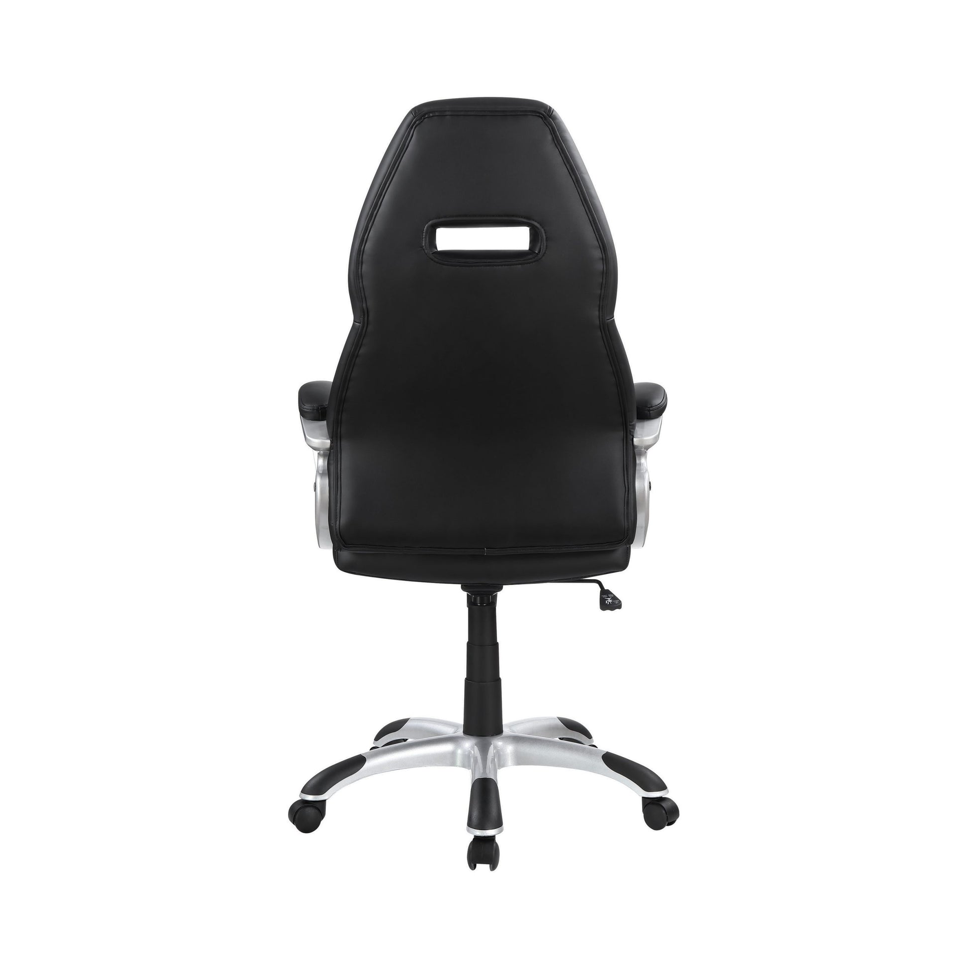 A dynamic silhouette marks the selling point of this black leatherette office chair. Bring an energetic look to a home or business office while providing outstanding comfort. Generously padded sections support extended sitting times, and armrests join adjustable seat heights to ensure ideal positioning. A high headrest makes it easy to avoid neck strain. Move about with ease on a caster wheel base. SKU: 801296 NAME : Adjustable Height Office Chair Black And Silver