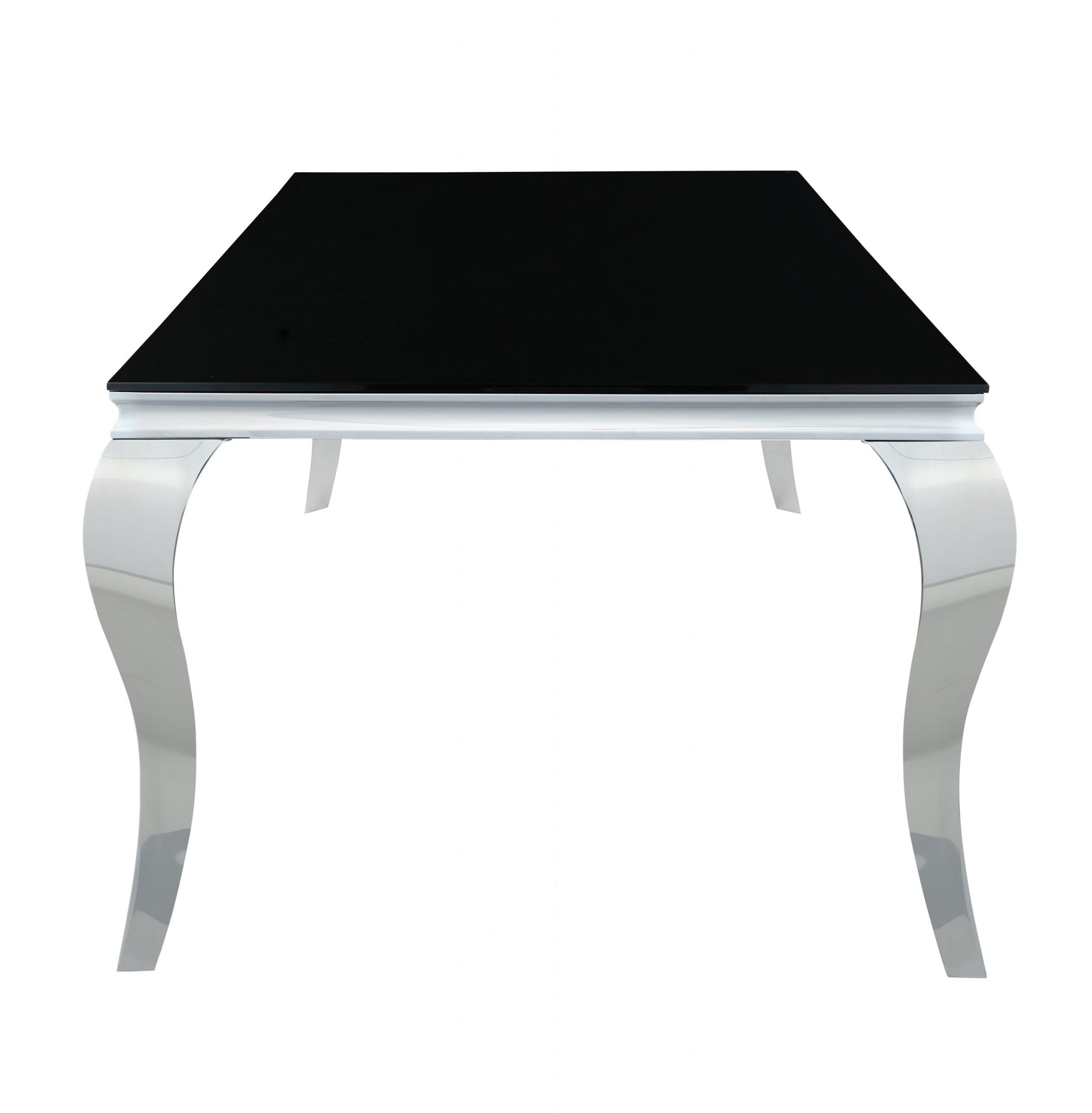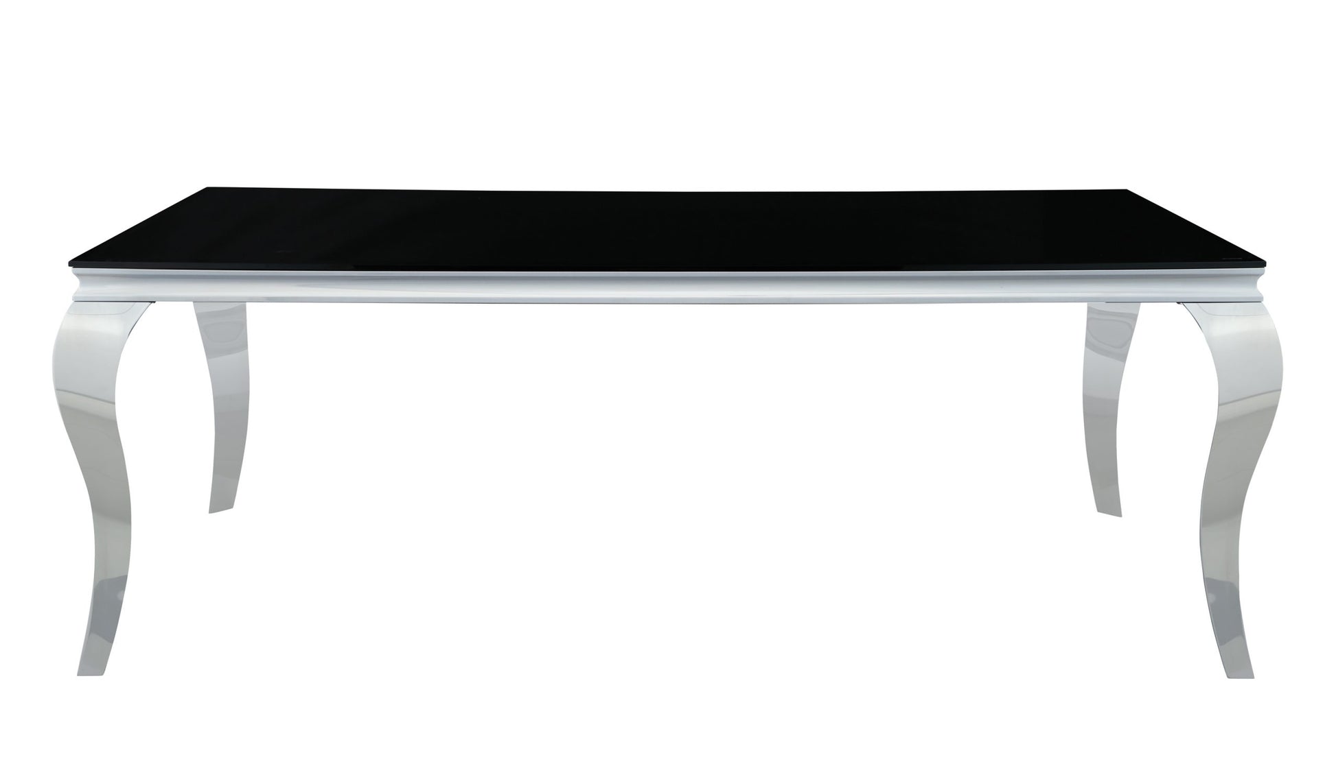 Glamorous with a luxurious touch, this elegant dining table makes the perfect addition to a formal dining space. With a mixed material design of durable stainless steel and glass, this dining table lends itself to several home decor styles. On each traditional Cabriole style leg is a gleaming chrome finish. Gather family and guests around the opaque tempered glass tabletop. In addition, this dining table seats six people comfortably. SKU: 115071 NAME : Carone Rectangular Glass Top Dining Table Black And Chrome
