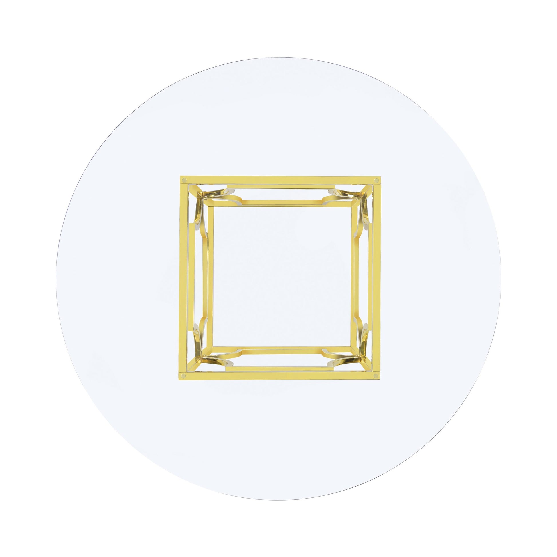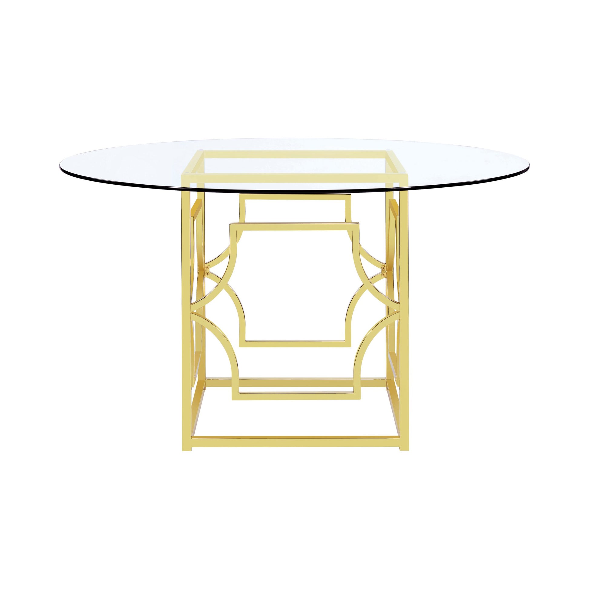 Sculptural and versatile, this round dining table base makes a bold design statement. The geometric metal frame showcases interlocking curved motifs within a square form, finished in a reflective electroplated surface. Designed to support a glass top of your choosing, it blends architectural flair and modern polish while offering flexible styling for custom dining configurations.