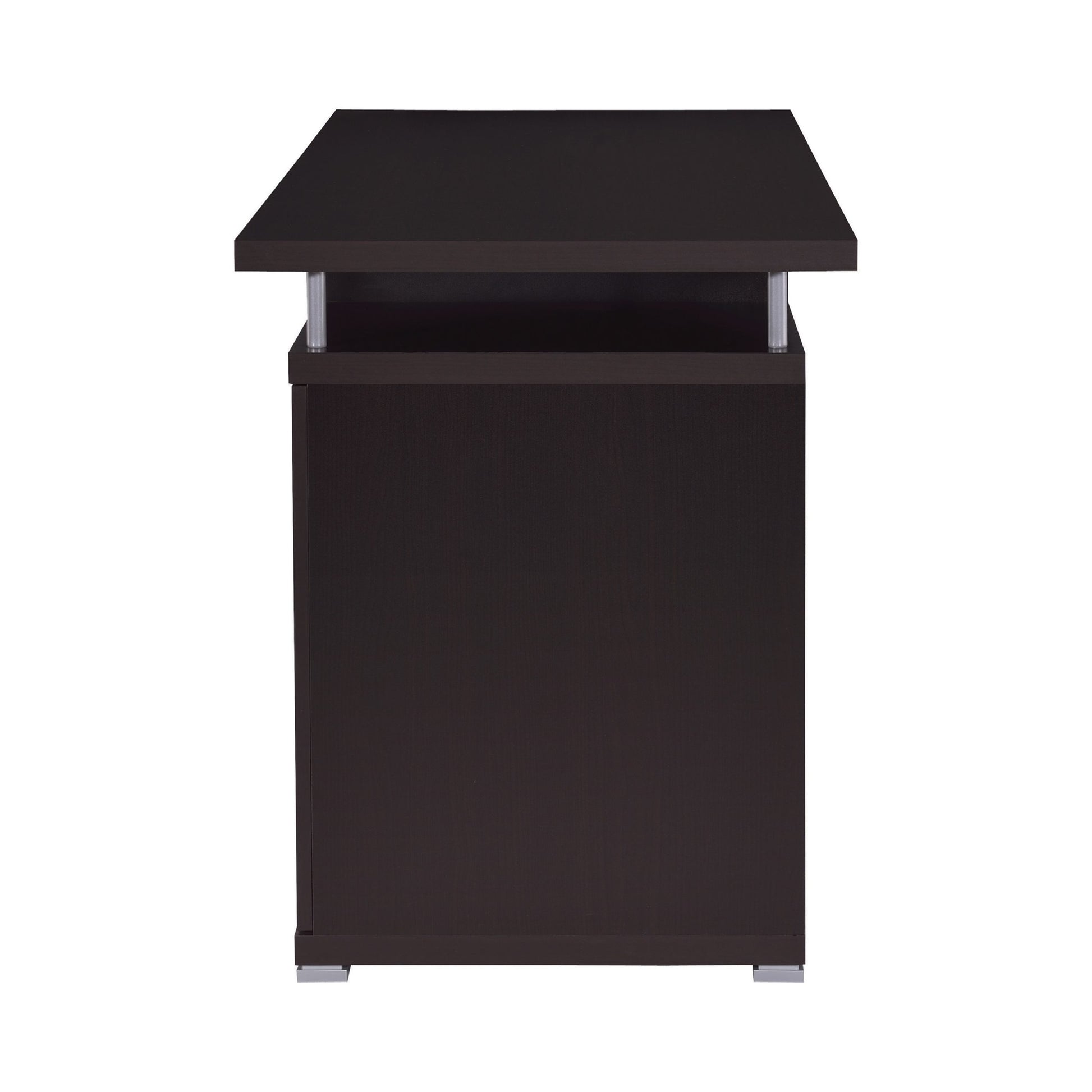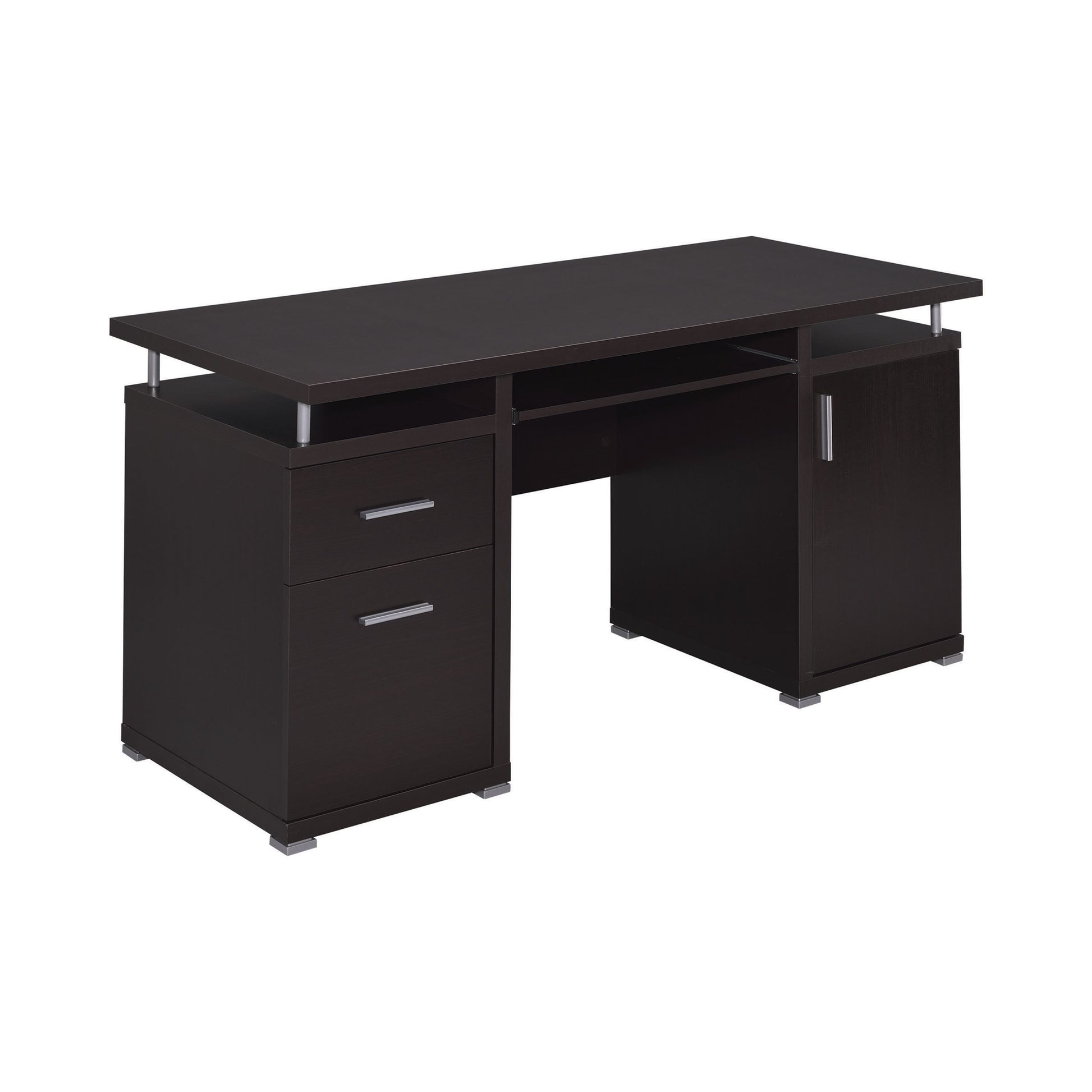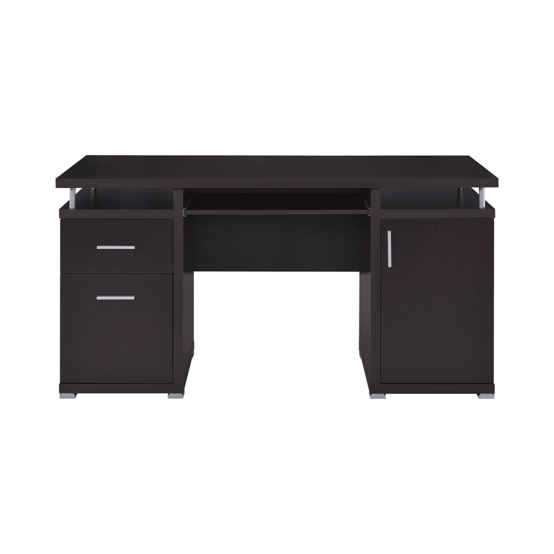 Upgrade your home office with sleek style and fabulous functionality. This handsome office desk has everything you need to be productive. Its large cabinet features an adjustable shelf for convenient storage. It includes a large file cabinet that fits legal and letter size files, as well as a smaller top drawer and keyboard tray. With a deep, rich finish of cappuccino, this desk is a stylish addition to any office. SKU: 800107 NAME : Tracy 2-Drawer Computer Desk Cappuccino