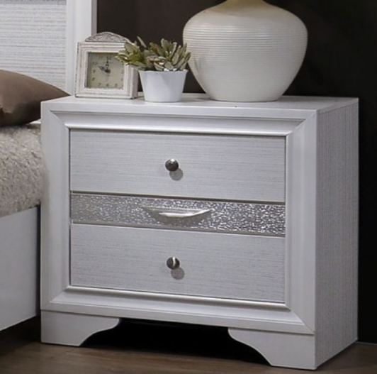 Brighten your room with the sheen and shine that this night stand delivers. The gleaming finish promotes a refreshing clean aesthetic with silver lines that glisten. Silver tone pulls detail the case goods brilliantly, offering an easy grasp to the one-of-a-kind jewelry drawers. Glimmering and glamorous, create the room you have always dreamed of.