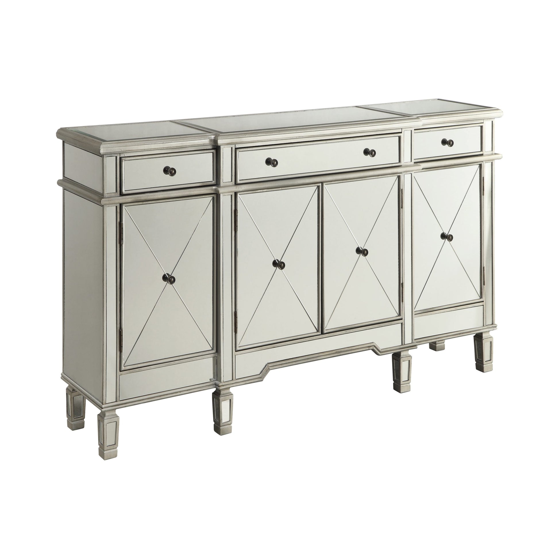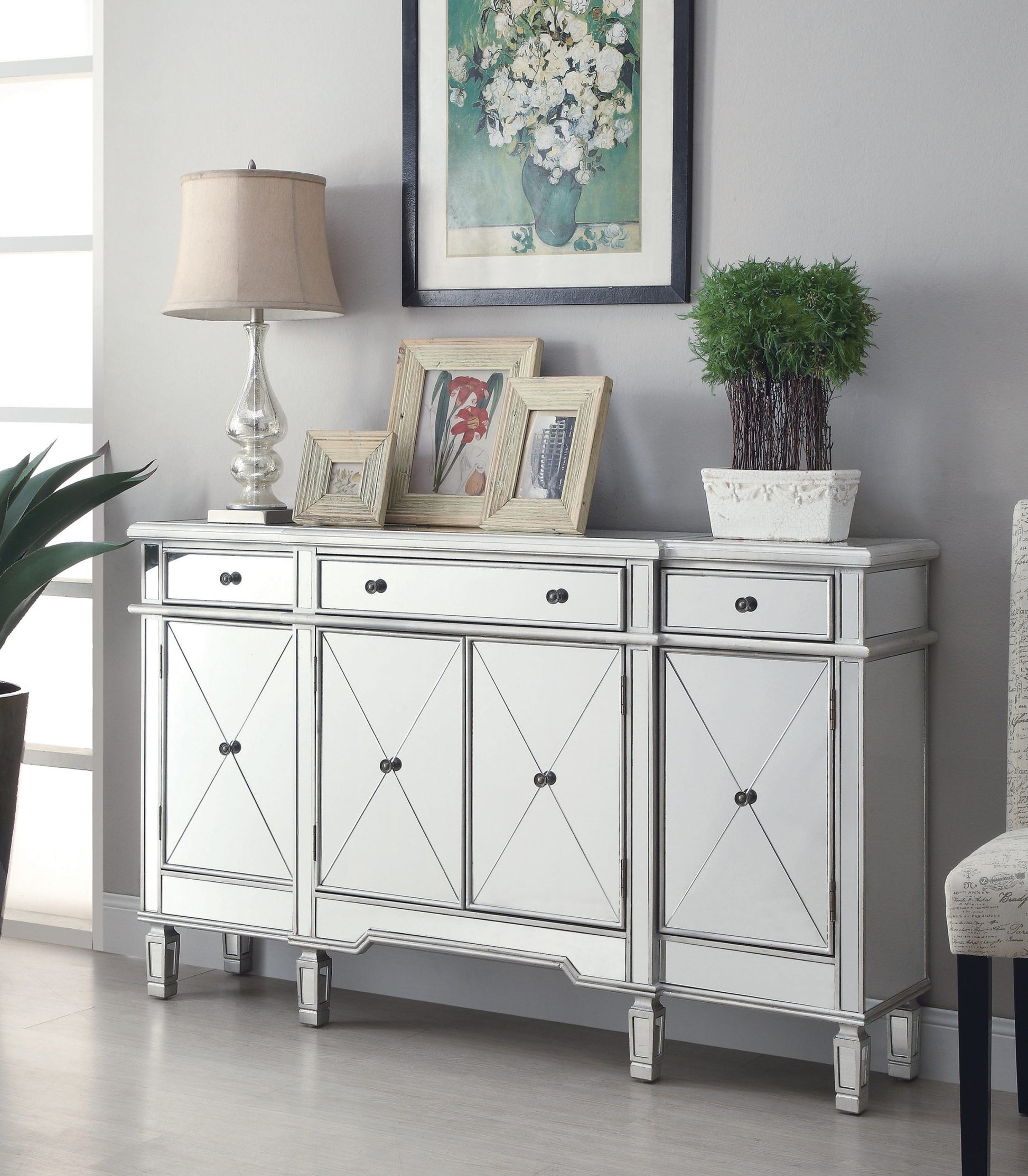 Large glamorous wine cabinet is a must-have for wine lovers. Distinctive mirror panels are a lustrous accent to any dining room or entertainment room. With four doors that open to your collection of vintages. Three drawers for stashing accessories like silverware and a cheese board. With two shelves and a removable wine holder, the next party is all yours to host. SKU: 102595 NAME: 4-Door Wine Cabinet Clear Mirror