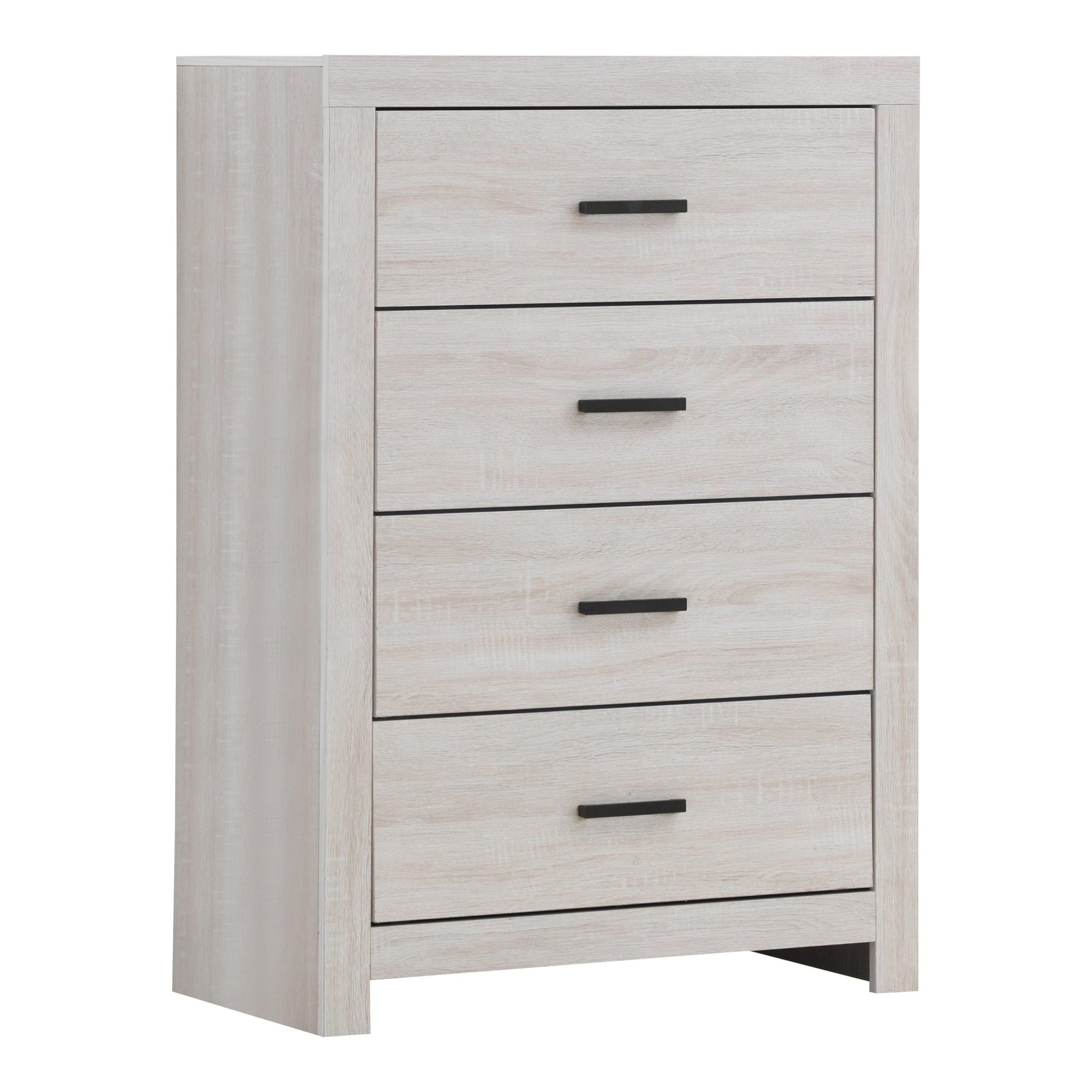 Give your bedroom a clean, classic look. This beautiful, wooden chest of drawers showcases crisp, clean lines and bronze hardware for a no-nonsense look. The five spacious drawers provide plenty of room to accommodate an extensive wardrobe. A 3D paper veneer is specially crafted for easy cleaning and maintenance. This piece is available in multiple finishes, giving you a variety of options to enhance your decor. SKU: 207055 NAME : Brantford 4-Drawer Chest Coastal White