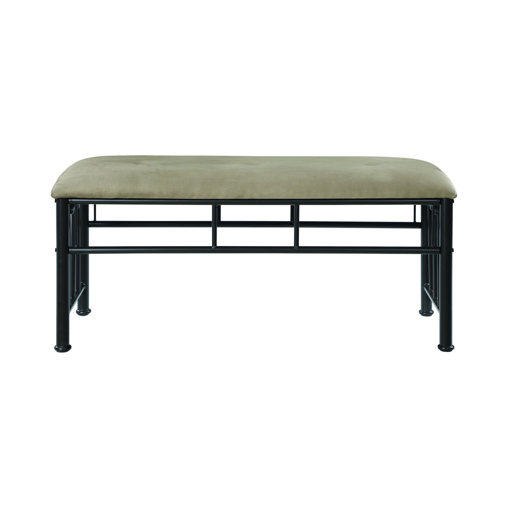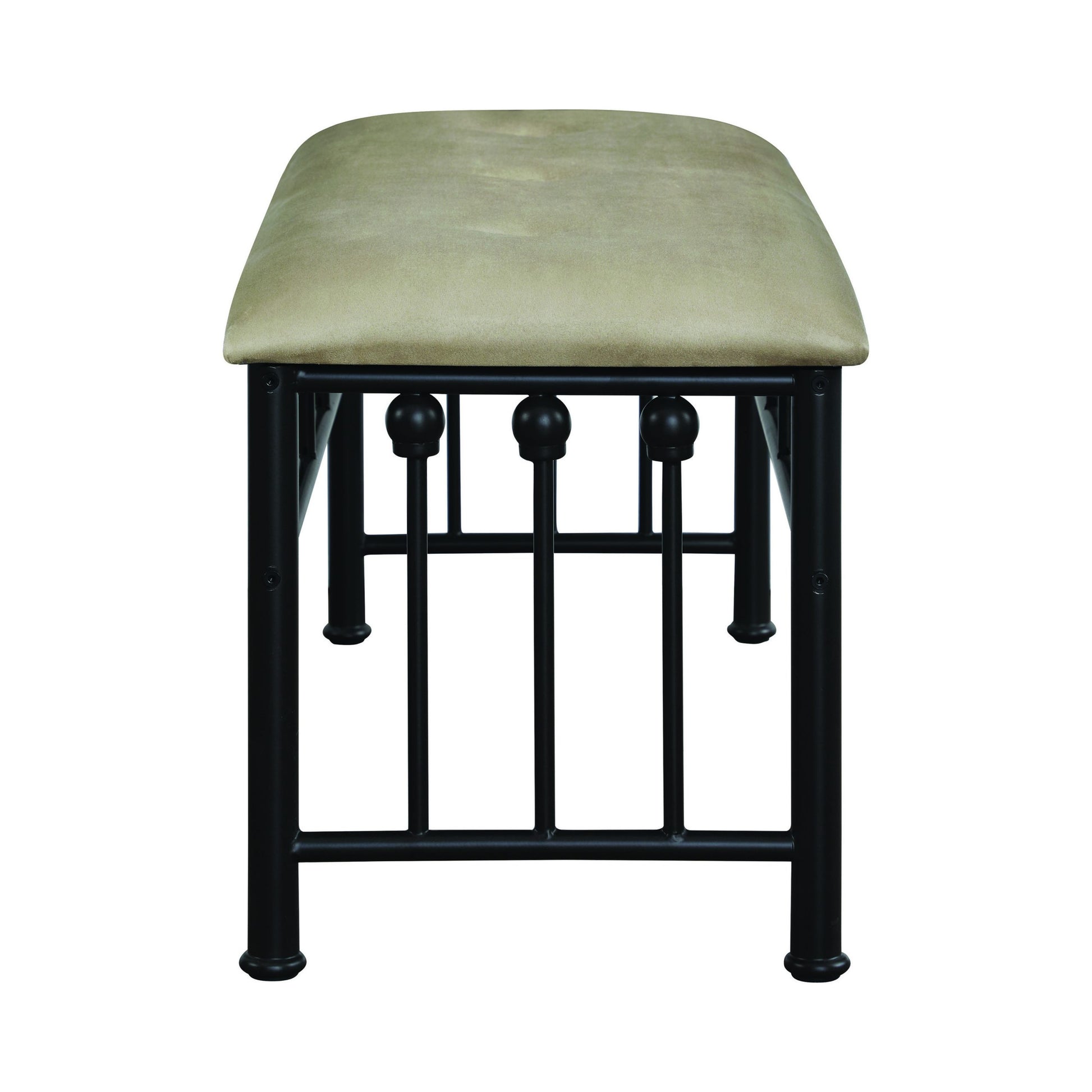 For extra seating or simply a decorative, fashionable edge, this padded bench embellishes a transitional space. Its linear steel frame features a gorgeous dark bronze finish that brings a warmth to blend with a variety of palettes. Steel tubing construction features solid mold-casted ornaments to spice up its overall design. Generous padding on a seat cushion with a brown microsuede cover makes this bench a perfect resting venue with flexibility. Make this bench part of a coordinated seating group, or place it alone to draw out the antique-inspired look of a traditional space. SKU: 301396 NAME : Livingston Upholstered Bench Brown And Dark Bronze