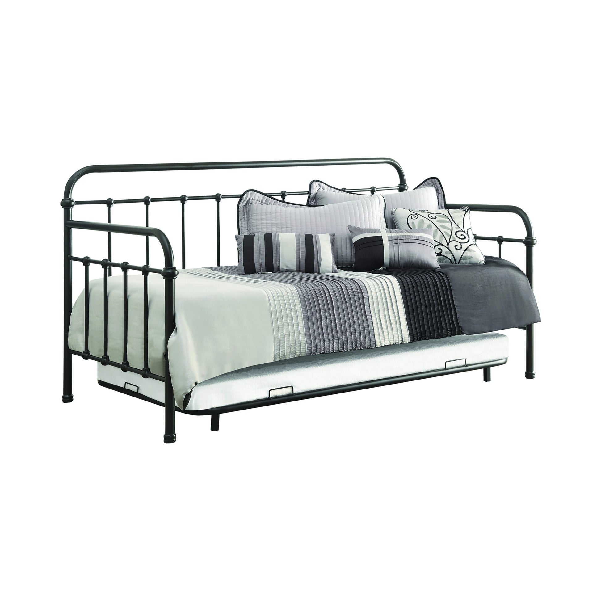 This twin metal daybed with trundle offers timeless farmhouse style with modern functionality. Designed with a sturdy heavy-gauge metal frame, it features a dark bronze powder-coated finish and a classic vertical spindle design. The built-in trundle smoothly pulls out, providing an extra sleeping space ideal for guests. Perfect for small spaces, this daybed combines durability, versatility, and vintage-inspired elegance.