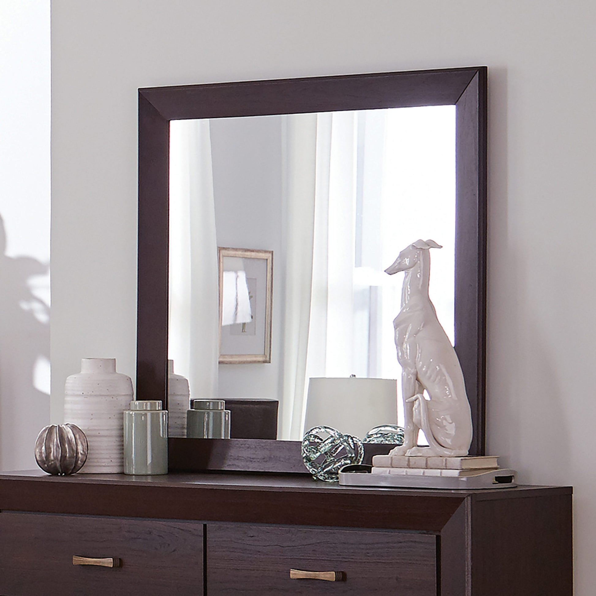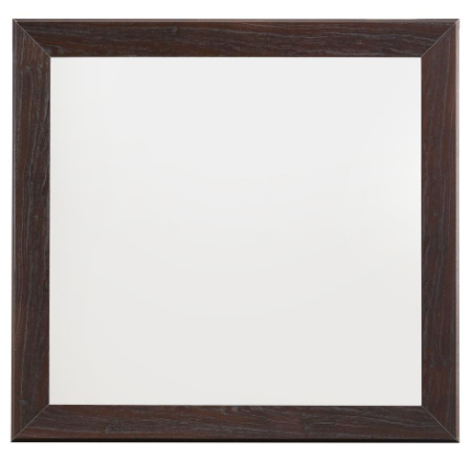 Perfect for a modern or retro motif, this transitional square mirror adds depth. The simple silhouette is full of clean lines and subtle angles. Warm up a space with the dark cocoa finish that features a slightly exposed wood grain. Create a sleek focal point above a dresser or alone on a wall. Open up a bedroom or hallway with the smooth details. SKU: 204394 NAME : Kauffman Rectangular Mirror Dark Cocoa