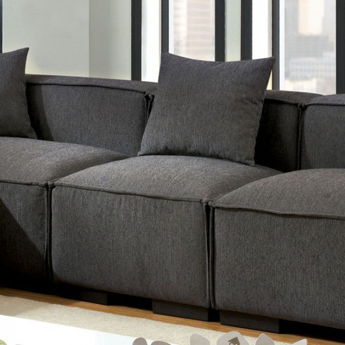 Padded in a gray color fabric , this corner sofa will complement any living room. Combine with multiple Right Chairs and Left Chairs for a modular masterpiece you can call your own! Matching pillow included. SKU: CM6037GY-CH NAME : LANGDON
