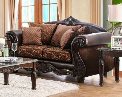 Visitors will wonder if they wandered into a palace when they enter and find this ornate love seat awaiting them. An elaborate wooden trim decorates the base and front of the rolled armrests and continues the frame to accentuate the top of the backrest. Sleek faux leather lines the flared arms and back while sumptuous chenille fabric covers the seat cushions in soft luxury. Resting atop elegantly turned bun feet, this love seat will earn your decorating respect and grant your home a majestic air.