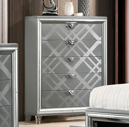 The enticing combination of glamour and Art Deco has long been attempted, but rarely with such successful results as achieved with this chest. It is a visual masterpiece, harkening to the days of Old Hollywood while establishing a rich, dynamic concept for the bedroom. The jewel-carved faux glass feet support the components with regal authority. Classic embossed patterns tie the chest together in one magnificent and highly desirable theme.