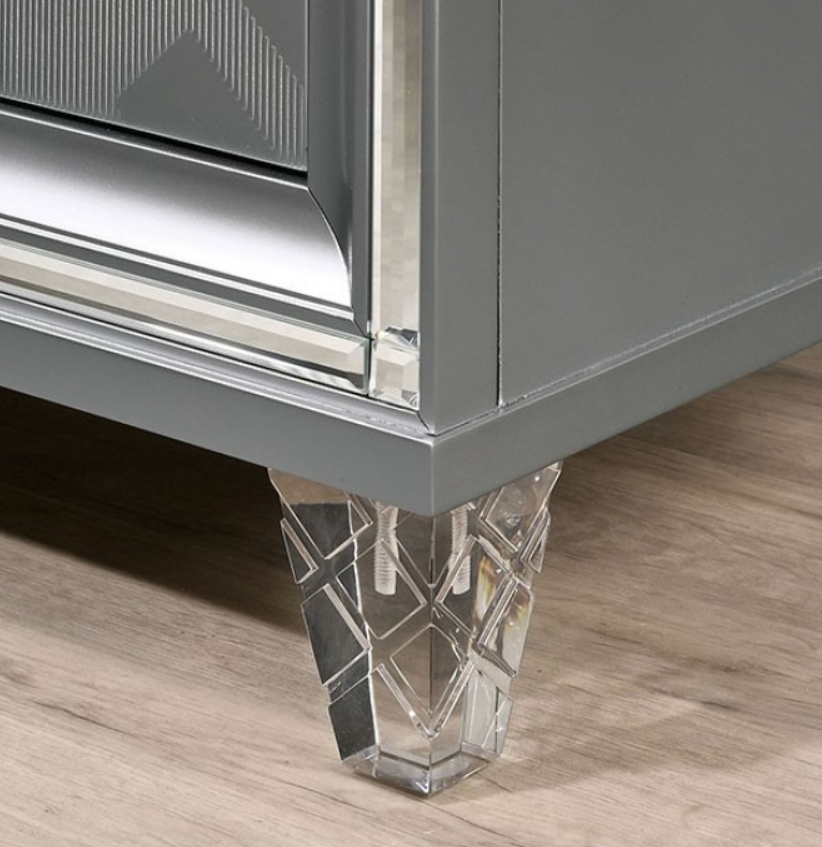The enticing combination of glamour and Art Deco has long been attempted, but rarely with such successful results as achieved with this dresser. It is a visual masterpiece, harkening to the days of Old Hollywood while establishing a rich, dynamic concept for the bedroom. The jewel-carved faux glass feet support the components with regal authority. Classic embossed patterns tie the set together in one magnificent and highly desirable theme.