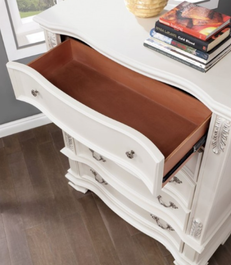If luxury is a necessity for the bedroom, then this bedroom set is a must-have. All drawers are dovetail construction--the top drawer feature felt-lining, middle drawer are birch, and bottom drawers made of cedar wood, a natural insect repellant. With all its lavish offerings, to say this traditional set is over-the-top would be a gross understatement.