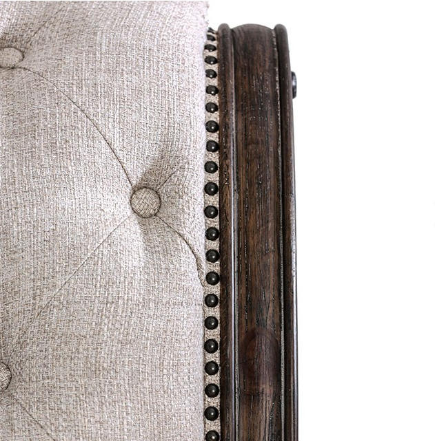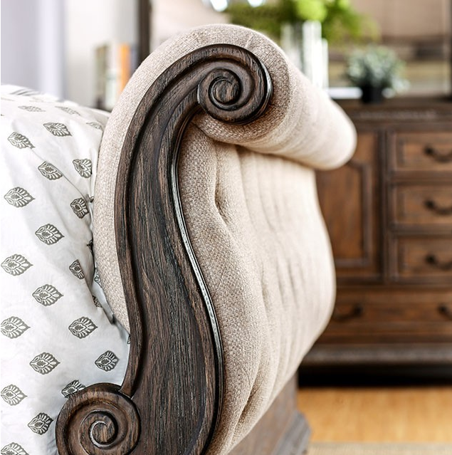 Luxury and style blends together to make this beautiful contemporary sleigh bedroom set. The fabric padded headboard and footboard provide warm comfort and paired button tufted details offer an extravagant finish. Case goods feature antique handles and the rustic natural wood finish creates a soothing bedroom environment. Make your sleeping area feel like a luxurious getaway with this extraordinary bedroom set! SKU: CM7663 NAME : LYSANDRA