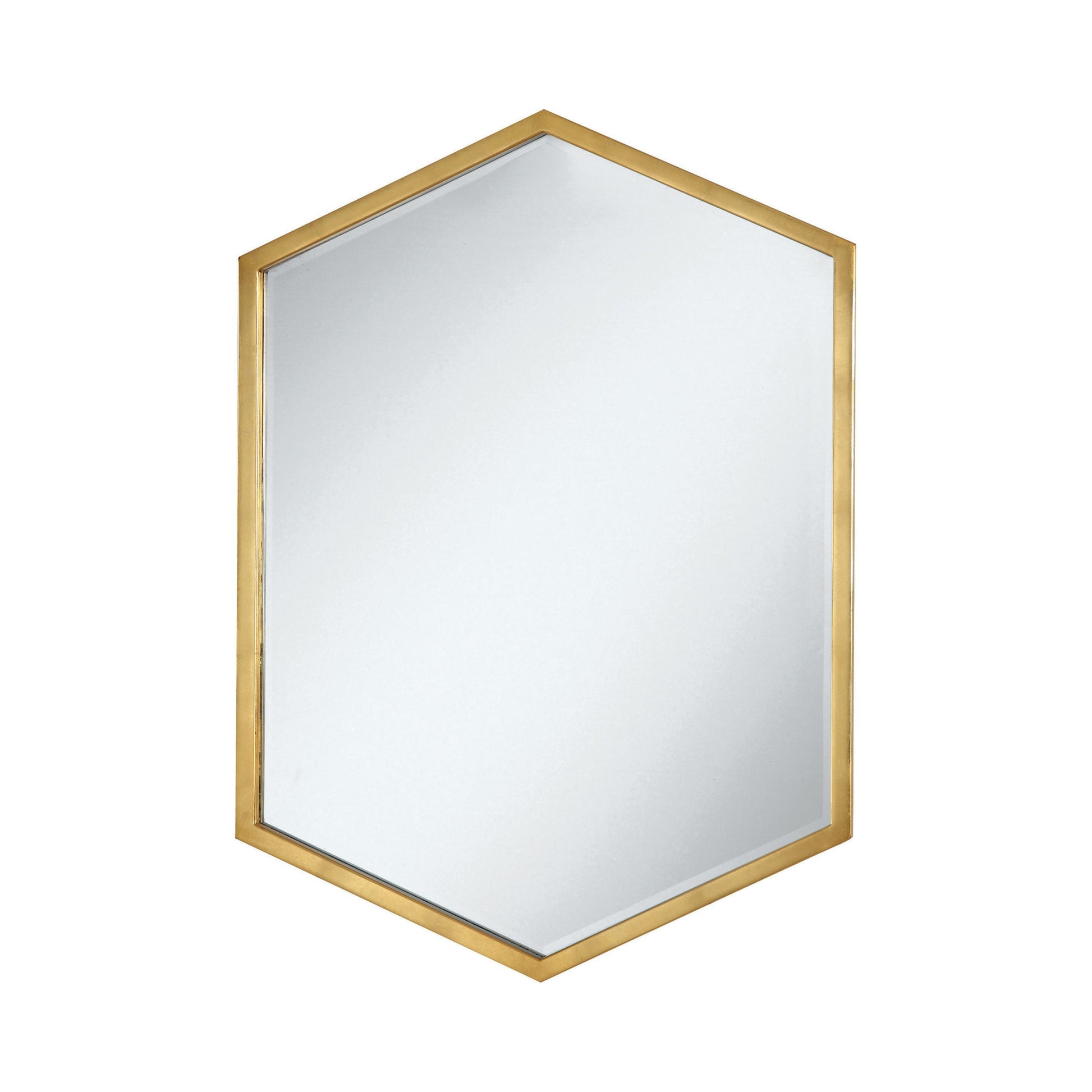 Reflect on the cool look of an intriguing shape. This hexagonal mirror adds a fresh contemporary boost to a living space or bedroom. Functional as well as beautiful, it nicely accents a console table or entryway. Enjoy the beauty of a gold frame that highlights its unique shape. Surround this elegant mirror with wall art to make it stand out.SKU: 902356 NAME : Hexagon Shaped Wall Mirror Gold