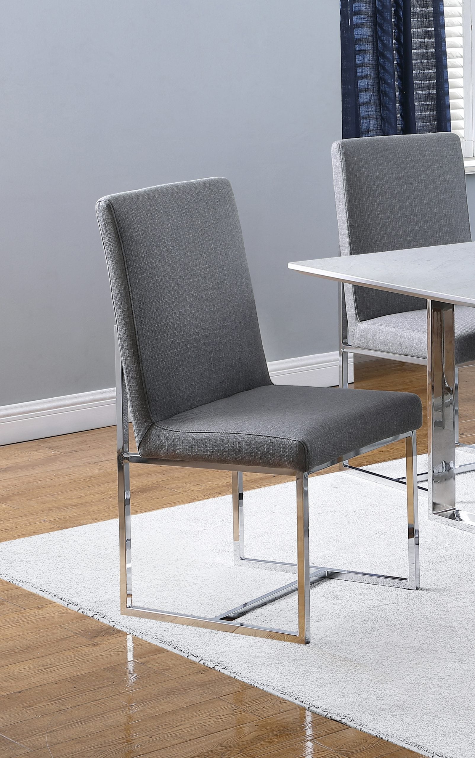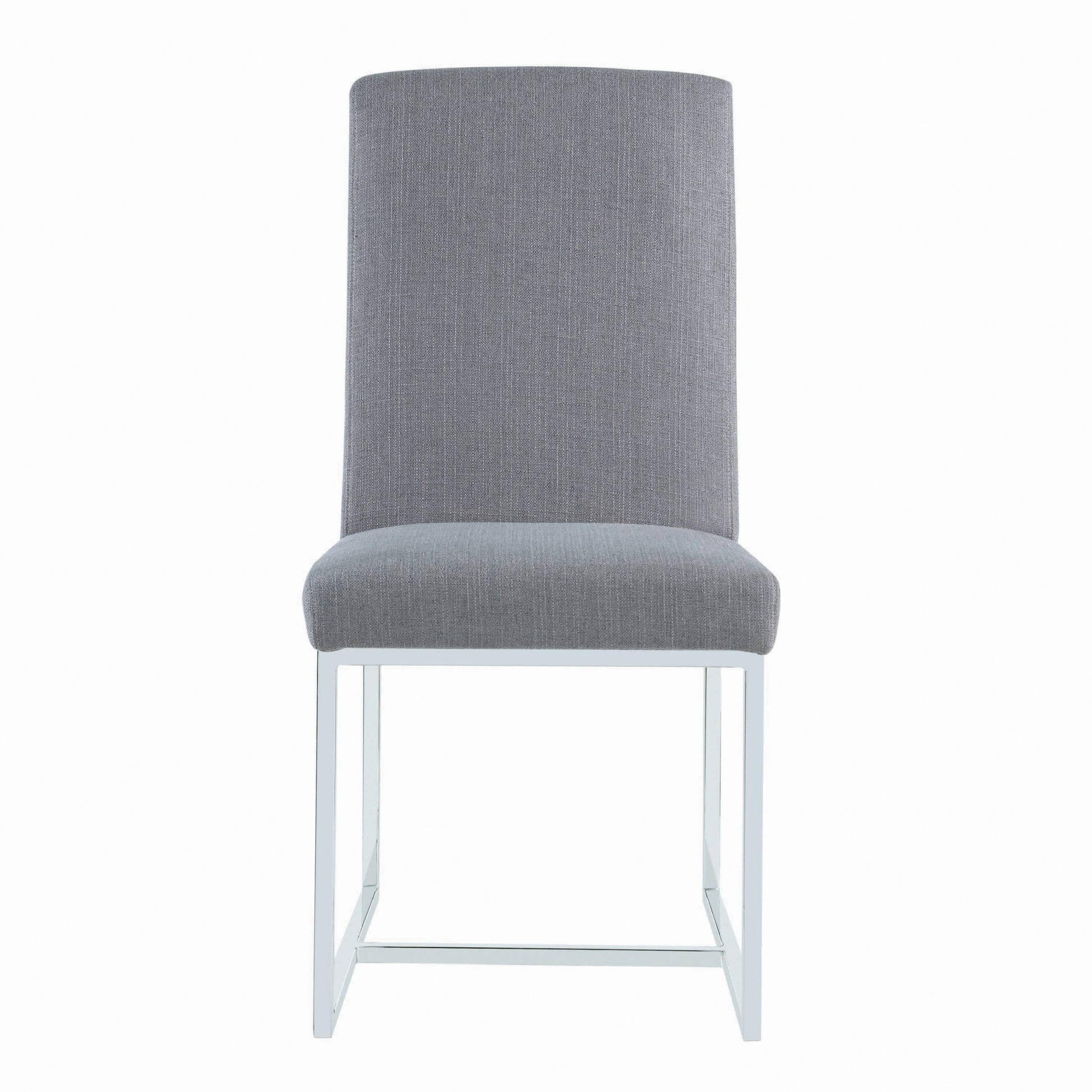 Elevate your dining space with this sleek and modern dining side chair, designed to blend style and comfort effortlessly. The chair features soft upholstery with a padded seat and backrest, providing a cozy seating experience for meals or gatherings. Its open metal frame, finished in polished chrome, creates a minimalist silhouette that adds a touch of contemporary elegance to any room. Perfect for both casual and formal dining settings, this chair complements a variety of decor styles, from modern to minimalist. Enhance your dining area with a chair that brings both visual appeal and functional design.