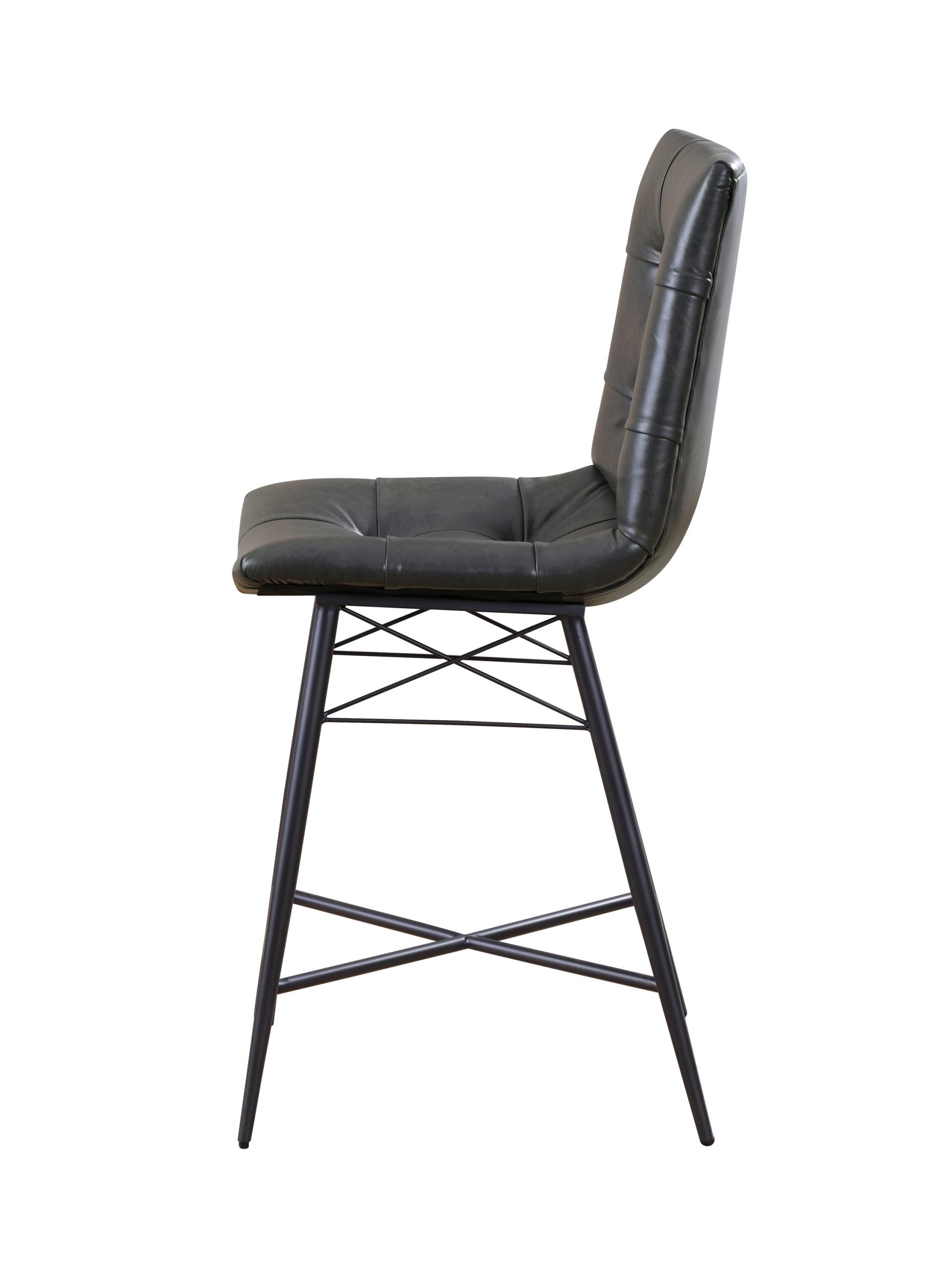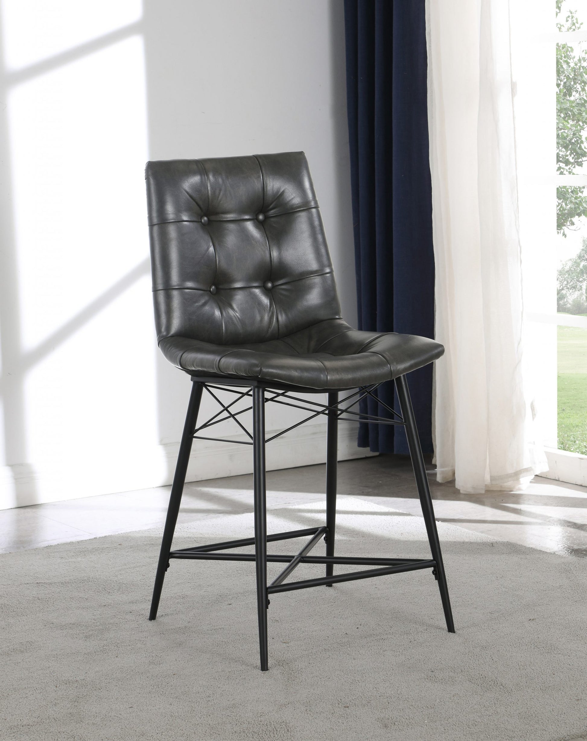 Cool and cozy, this counter height stool is the ultimate dining room upgrade. The padded seat is wrapped in smooth leatherette for an inviting look and feel. Button tufting adds a subtle, decorative touch. A sleek, metal base gives it a modern look while providing plenty of support. Crafted for comfort and lasting durability, this contemporary stool is a smart and stylish choice for the modern home. SKU: 107859 NAME: Upholstered Tufted Counter Height Stools Grey (Set Of 2)