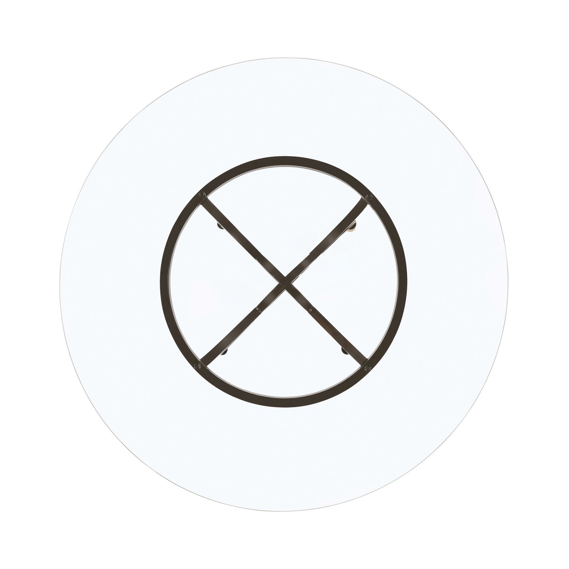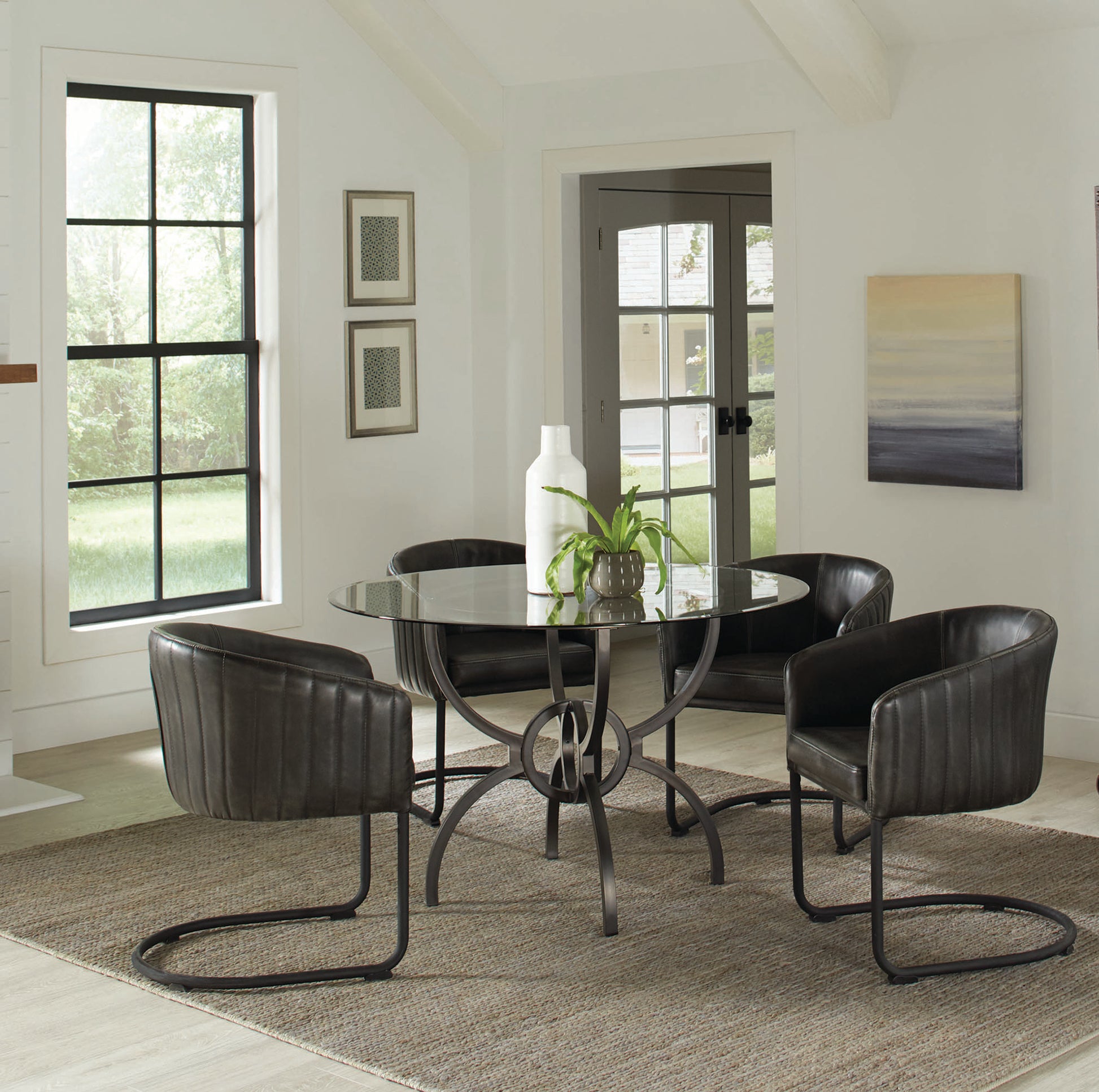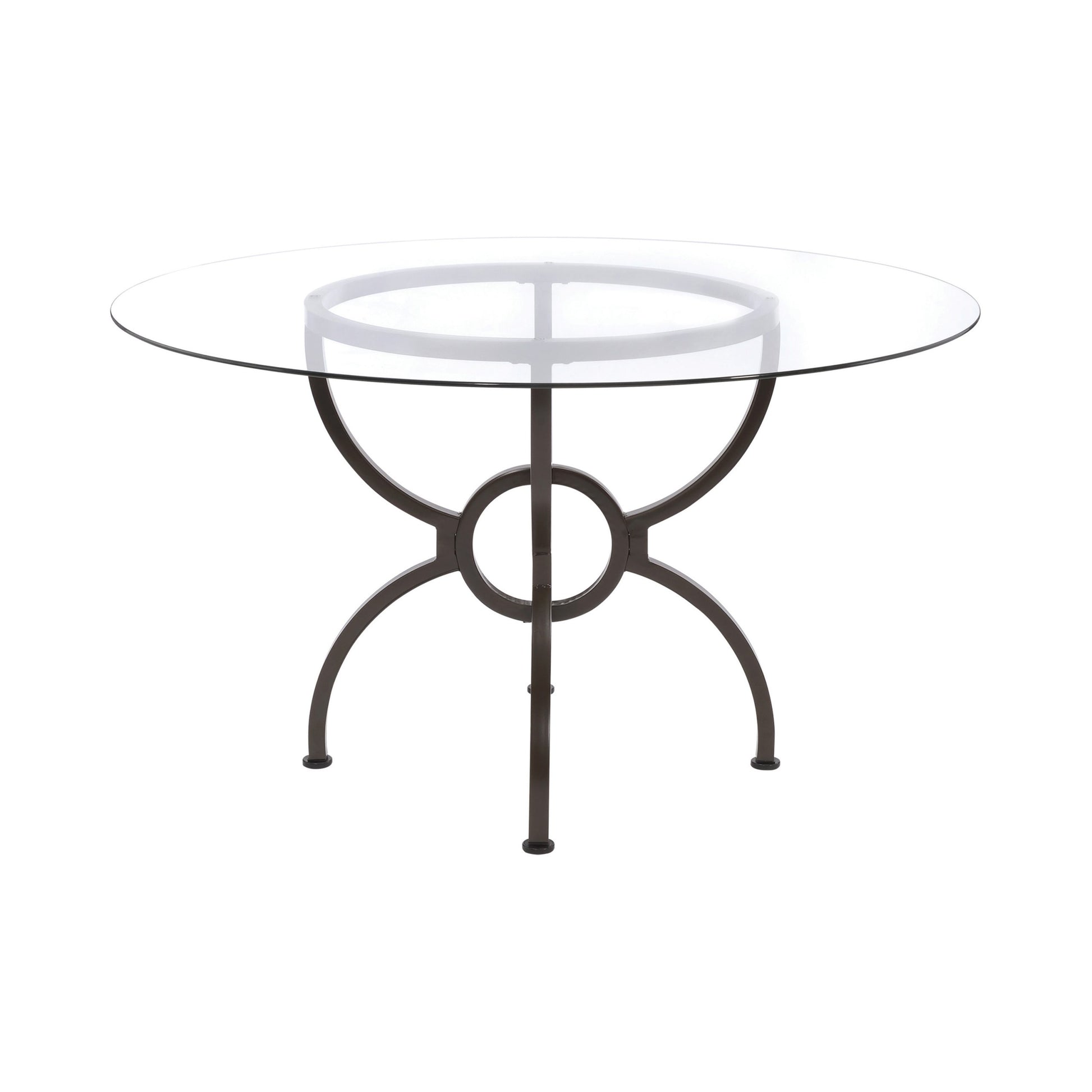 Curves abound on this intriguing transitional glass dining table. Featuring a casual and inviting aura, the table boasts a round of clear glass resting on a bold base. The base shows off metal construction with four stylized M legs that meet in an interlocking ring motif. A gunmetal finish lends a rich final touch. This 30-inch table is perfect for a stylish breakfast nook or eat-in kitchen. SKU: 108291 NAME : Aviano Dining Table Base Gunmetal