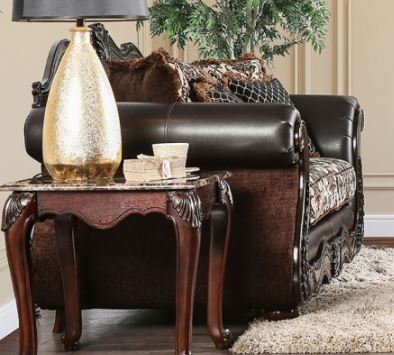 Visitors will wonder if they wandered into a palace when they enter and find this ornate love seat awaiting them. An elaborate wooden trim decorates the base and front of the rolled armrests and continues the frame to accentuate the top of the backrest. Sleek faux leather lines the flared arms and back while sumptuous chenille fabric covers the seat cushions in soft luxury. Resting atop elegantly turned bun feet, this sofa set will earn your decorating respect and grant your home a majestic air.