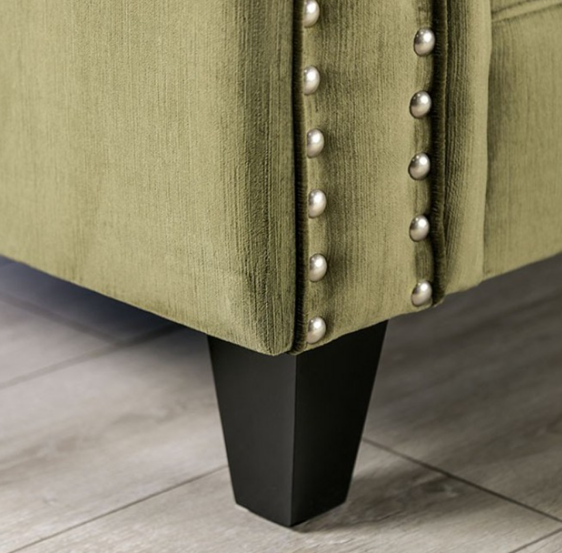 You want something different, but not flashy. You want it dignified but not boring. Enter this line-textured American-made sofa of the unique kelp color. The presence of great details like button tufting and nail head trim fail to overwhelm the attractive design.