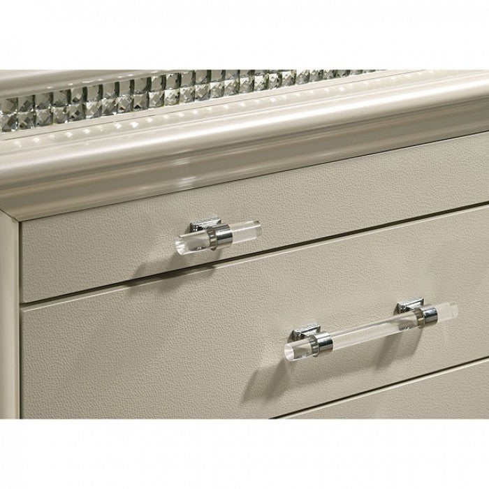 Create a room made for a princess with this bedroom set from the Maddie Collection. The curved headboard is padded and upholstered in a horizontally-tufted leatherette, emphasizing the pearl white finish. The dresser and chest feature acrylic legs, crystal accents, and a beveled mirror with a LED light creating a glamorous aesthetic. Give into your glitzy side with this opulent set. SKU:CM7899 NAME : MADDIE