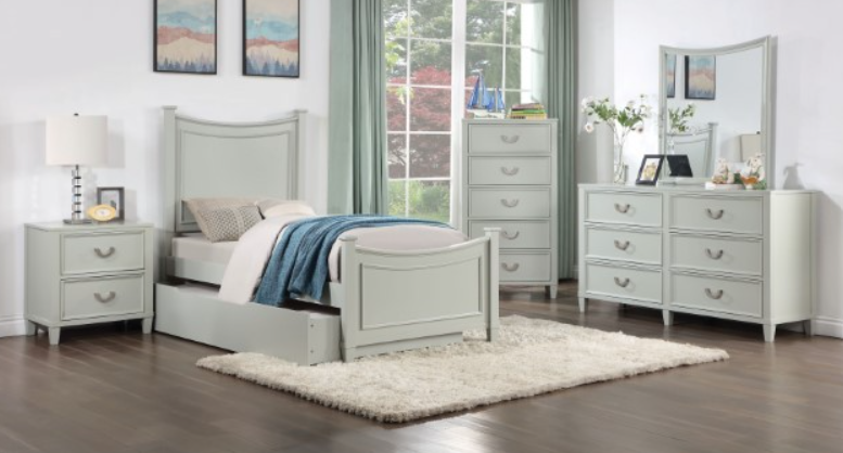 Reminiscent of baby cradles, the reverse arches on the mirror make this bed a charming addition to any bedroom. The light gray finish makes for a great gender-neutral option for any family wanting to upgrade their kids' space.