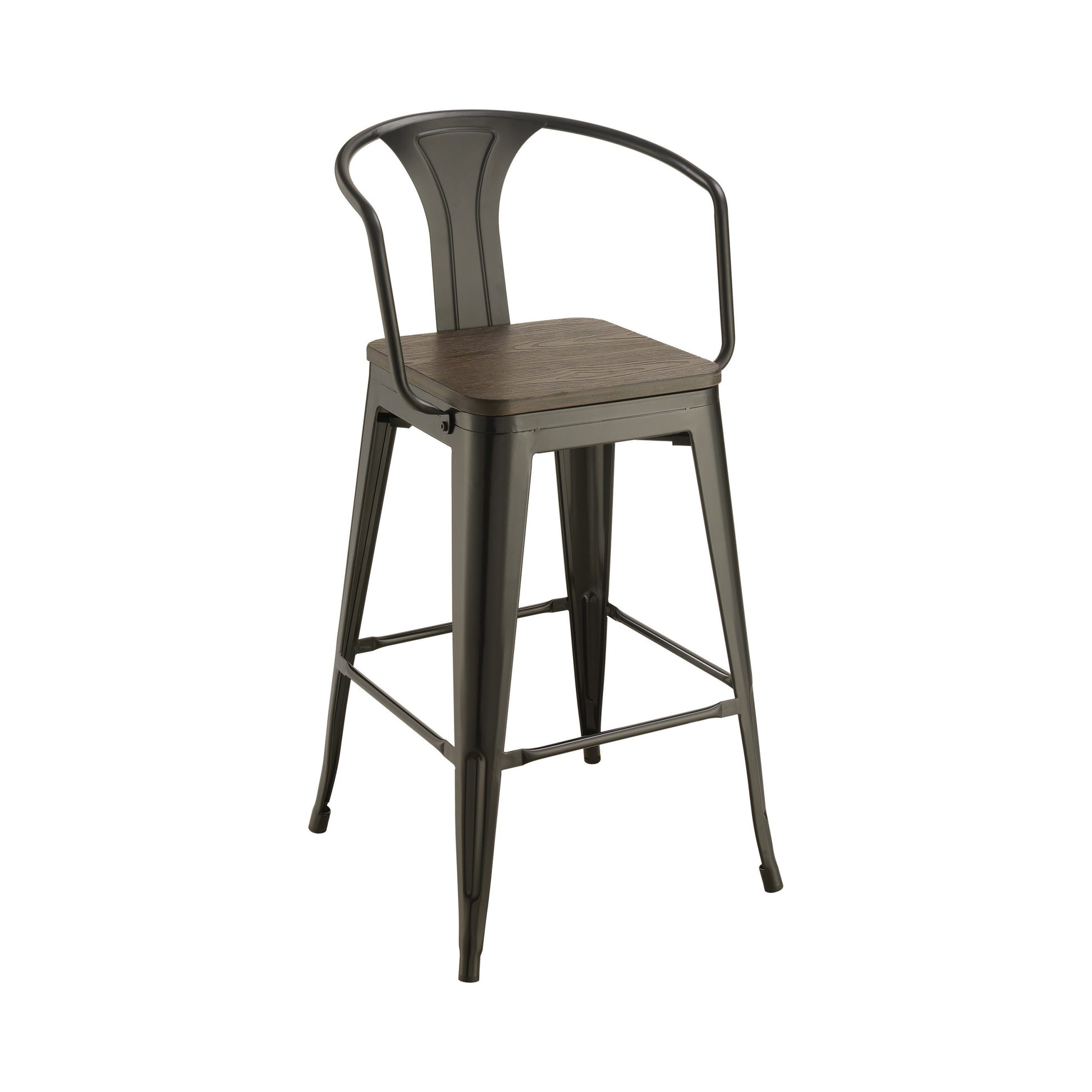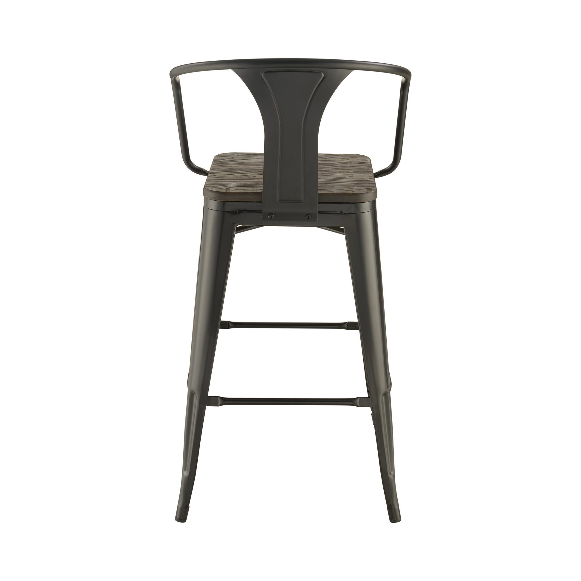 Add a touch of industrial flair to your bar or kitchen area with this Tolix style bar chair, featuring a blend of metal and wood-inspired textures. The chair boasts a sturdy metal frame with a sleek matte black finish, paired with an embossed solid bamboo seat in a dark elm finish. Its curved backrest and integrated armrests provide ergonomic support, allowing for relaxed seating during meals or gatherings. With its minimalist design and durable construction, this chair is perfect for both home and commercial settings. The combination of rustic wood tones and modern metal accents makes it a versatile addition to any decor, offering both comfort and style.
