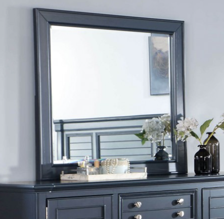 Gorgeous lines and a grand silhouette give this bedroom furniture a distinctive edge. Molding details on each case good's front give it a country twist that's amplified by the bold slate blue finish.
