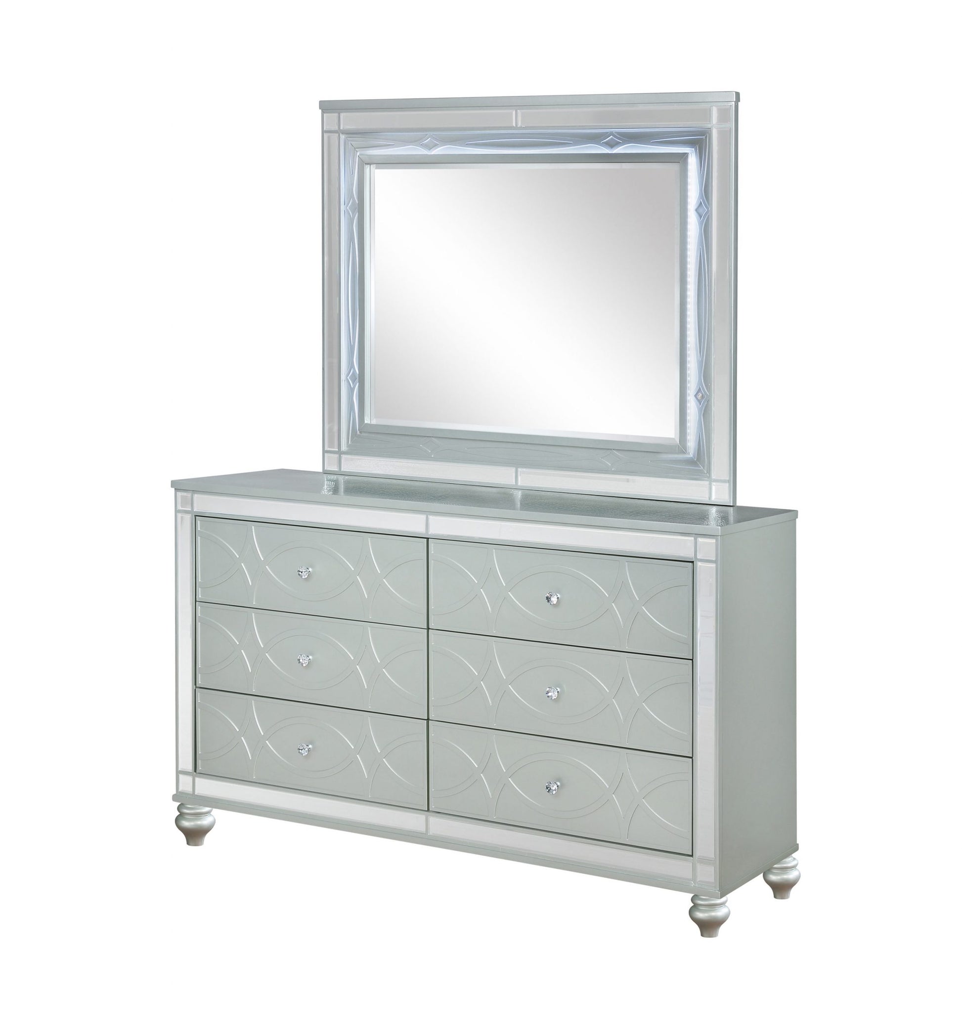 Bring a little glam to your mirror game with this glitzy transitional mirror. The rectangular design features a frame that boasts decorative fret work detail. The mirror glass is beveled at the edges for a clean, polished look. It comes in a vibrant silver metallic finish that radiates throughout any room. It looks great affixed to a glam dresser or as a standalone on the wall, adding a fab modern presence to any bedroom, walk-in closet, or sitting room. SKU: 223214 NAME: Gunnison Dresser Mirror With LED Lighting Silver Metallic