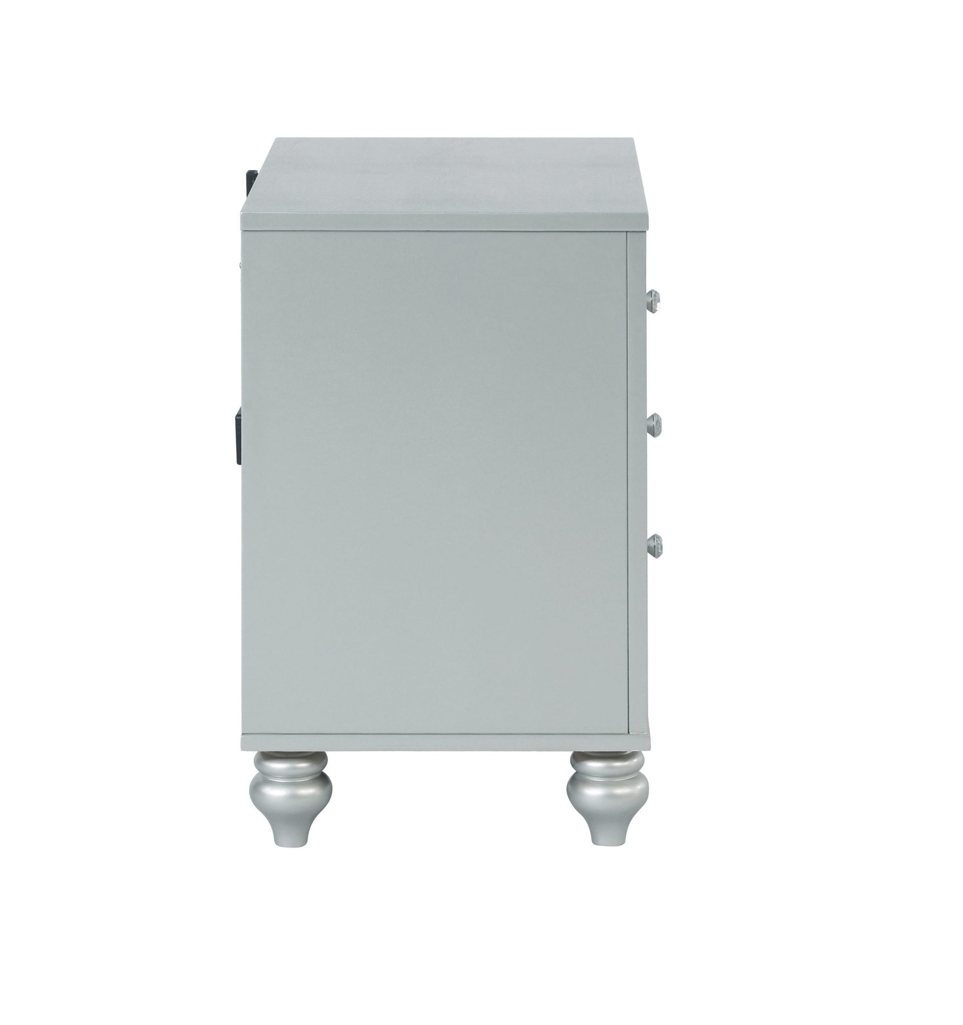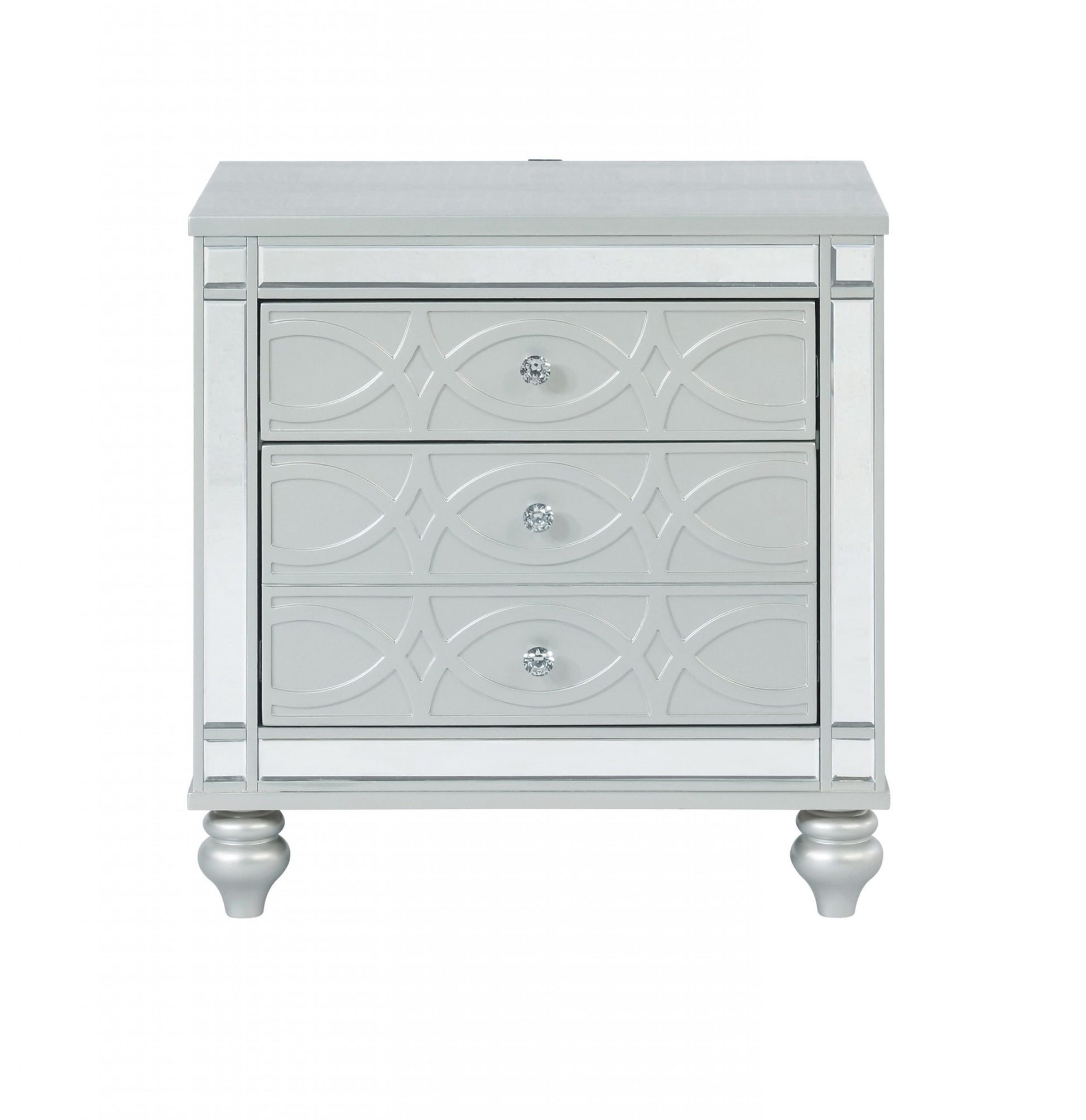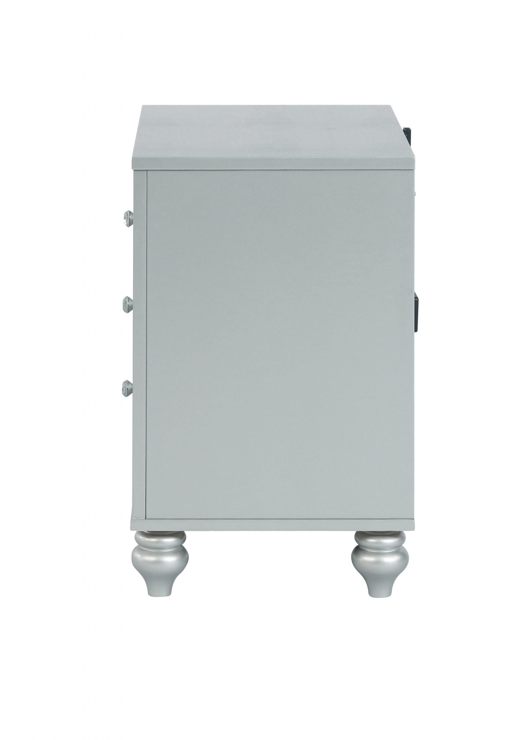 Bring modern glam to a classic design with this transitional two-drawer nightstand. It features a glitzy design that draws the eye in any modern home. It’s crafted with a vibrant silver metallic finish with fret work detail on the front panels and drawer fronts. The drawers are adorned with crystal-like pulls and the top one is lined with black felt. Dual USB ports and delicate bun feet complete the design of this exquisite accent piece. SKU: 223212 NAME:Gunnison 2-Drawer Nightstand Silver Metallic