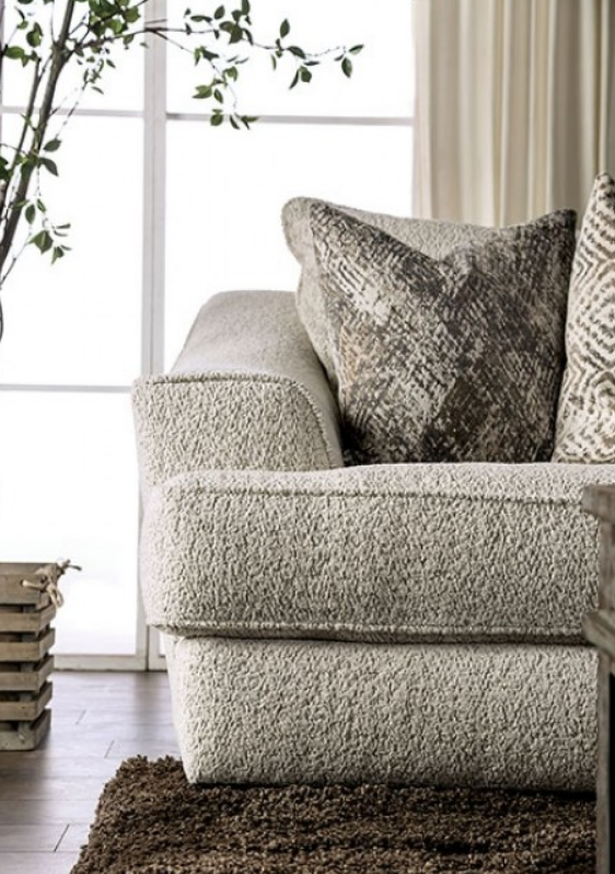 Bright grays and whites work in harmony to produce this stunning set. Welt trim outlining the collection arms and cushions and a unique textured fabric give each piece a timeless feel. Cushions are reversible offering impeccable comfort with spring seats and webbed back suspensions. Included pillows with ashy graphics are filled with luxurious down fiber bland. The off-white color adds to this allure - a neutral that works so well with most home motifs.