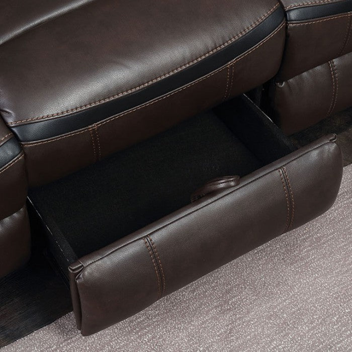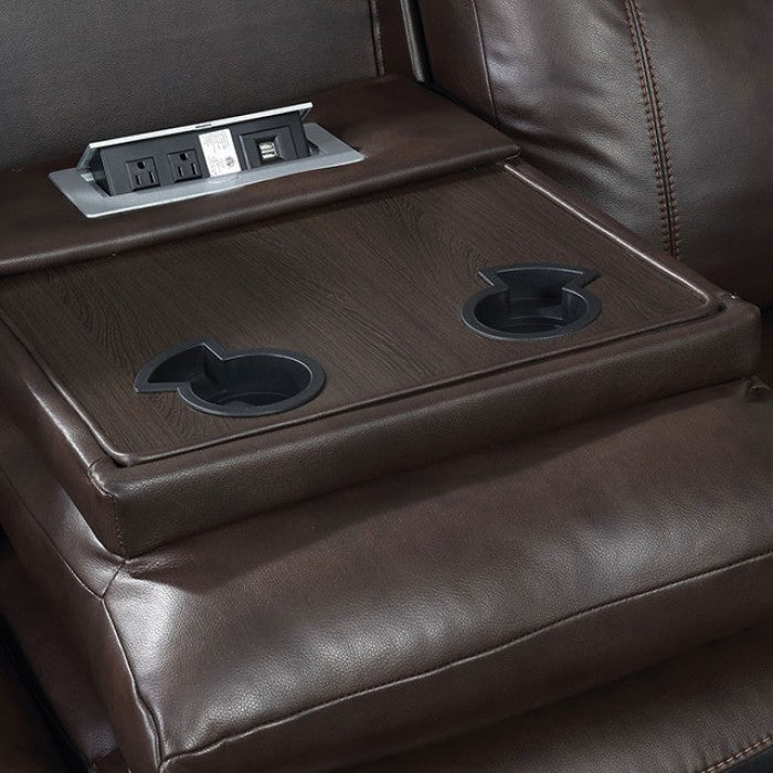 Plush comforting cushions are paired with design-forward functionality to create this uncompromised sofa and love seat set. Bask in breathable leatherette and dive into dense foam cushions while the latch activated leg rests keep you undeniably relaxed. Rest drinks on the center console, store controllers in the sleek hidden storage and easily charge your phone with the built-in USB port. The handy companion allows for undisrupted relaxation and the smooth brown finish brings warm homey tones to your living room. SKU: CM6297-LV NAME : CHENAI