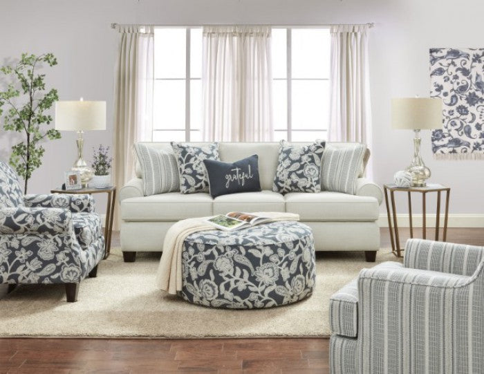 Conceived in part to be cost-efficient, this set enjoys a smaller scale that is elevated by grand styles. The ivory-colored sofa serves as the centerpiece; english-style rounded low-profile arms are accented by welt-cord trim while the tapered solid wood feet are darkly stained. Matched with a nearly identical petite-statured loveseat, the pair shares pillows featuring patterns that correspond directly to those of the chairs and ottoman.