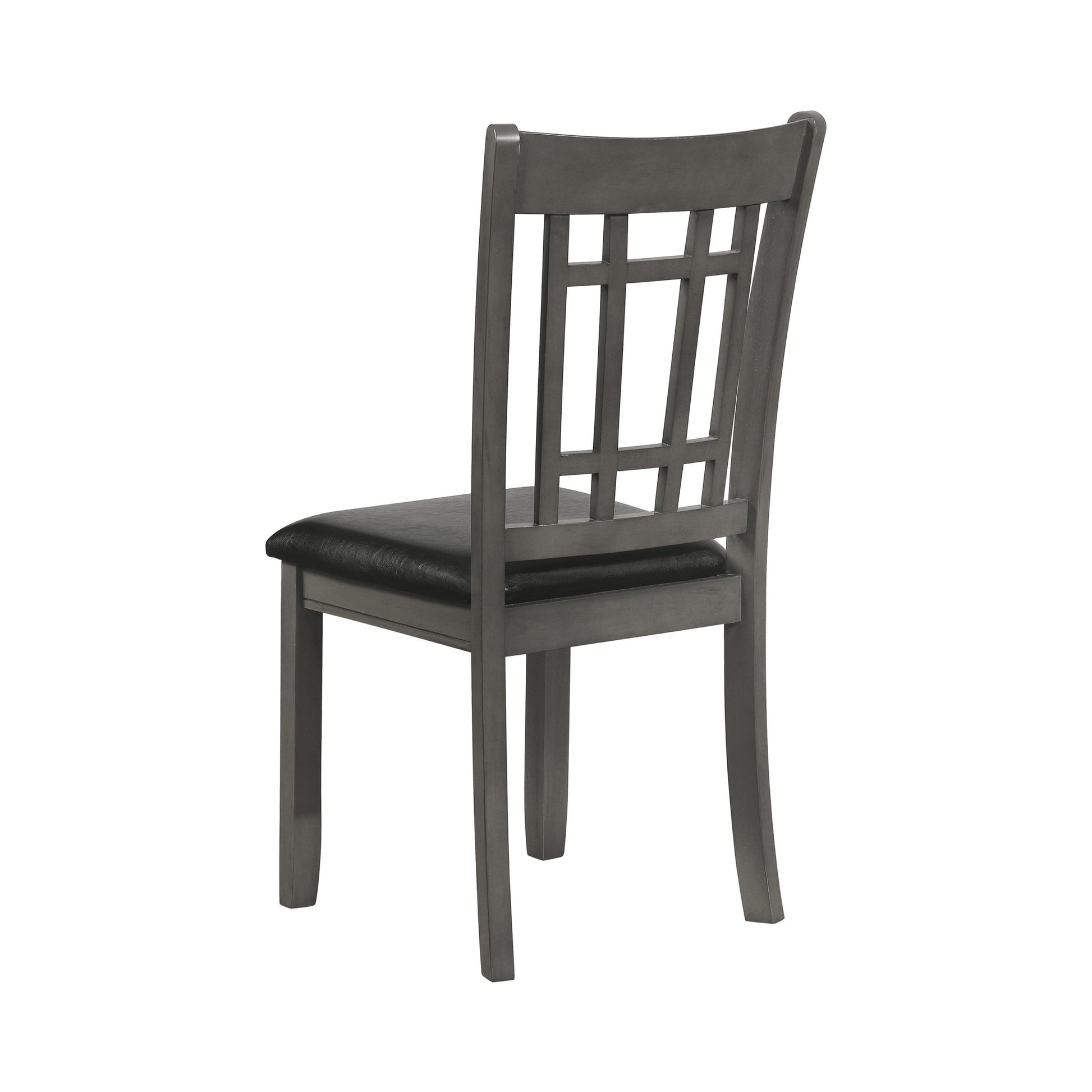 A combination of vertical and horizontal slats creates a window pane effect for this charming transitional dining chair. An armless silhouette is a versatile choice for relaxed, everyday living. The chair boasts a medium grey finish over Asian hardwood construction. Webbed seating and black faux leather upholstery combine for stylish comfort. Invite friends and family to have a seat and enjoy a lovely meal.