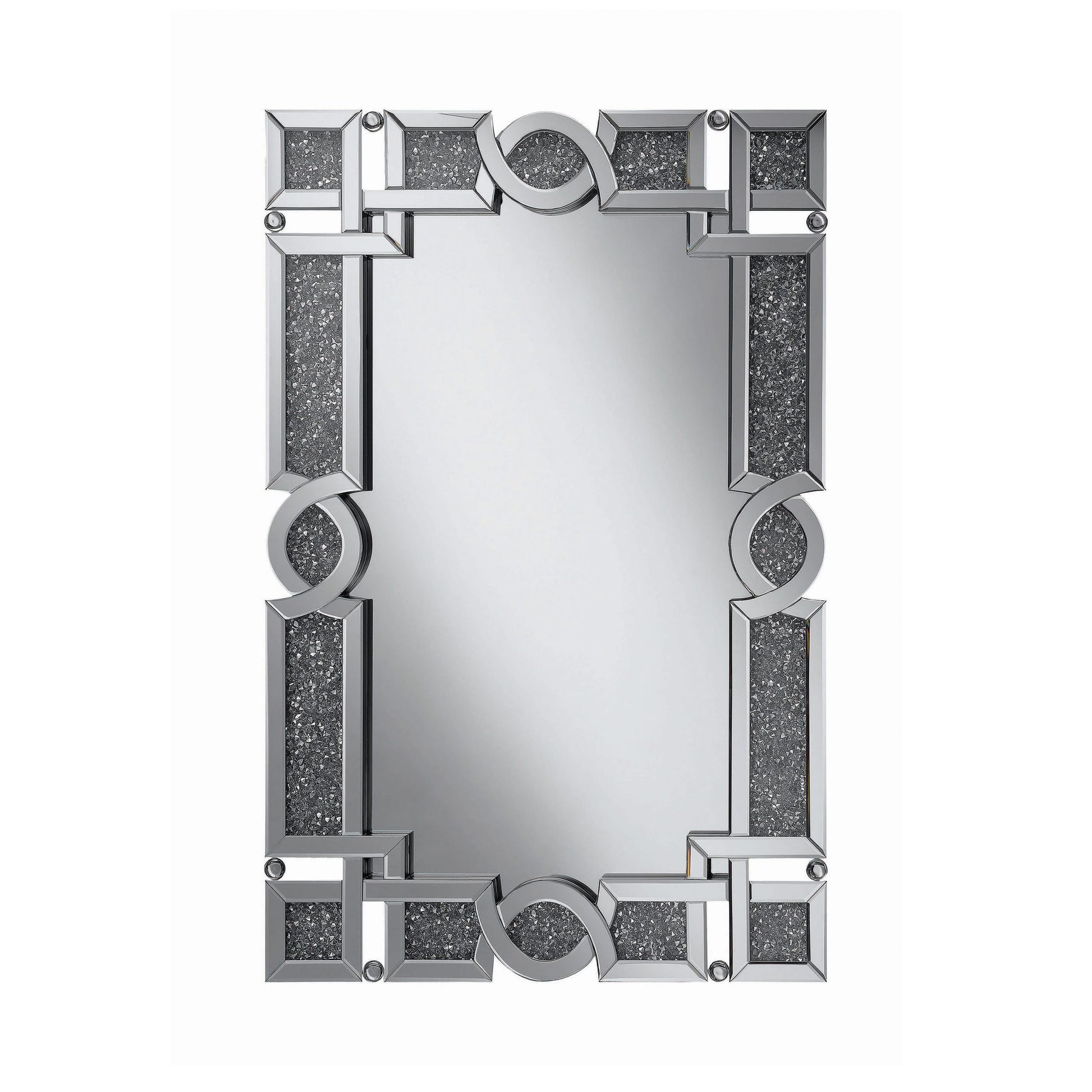 Elevate your space with this contemporary wall mirror featuring a bold geometric frame adorned with silver mirrored tiles and glittering dark crystal accents. Its intricate design blends glamor and modern art, creating a striking focal point above a sideboard, hallway console, or fireplace. Reflective surfaces and open negative space add dimension and radiance to your room.