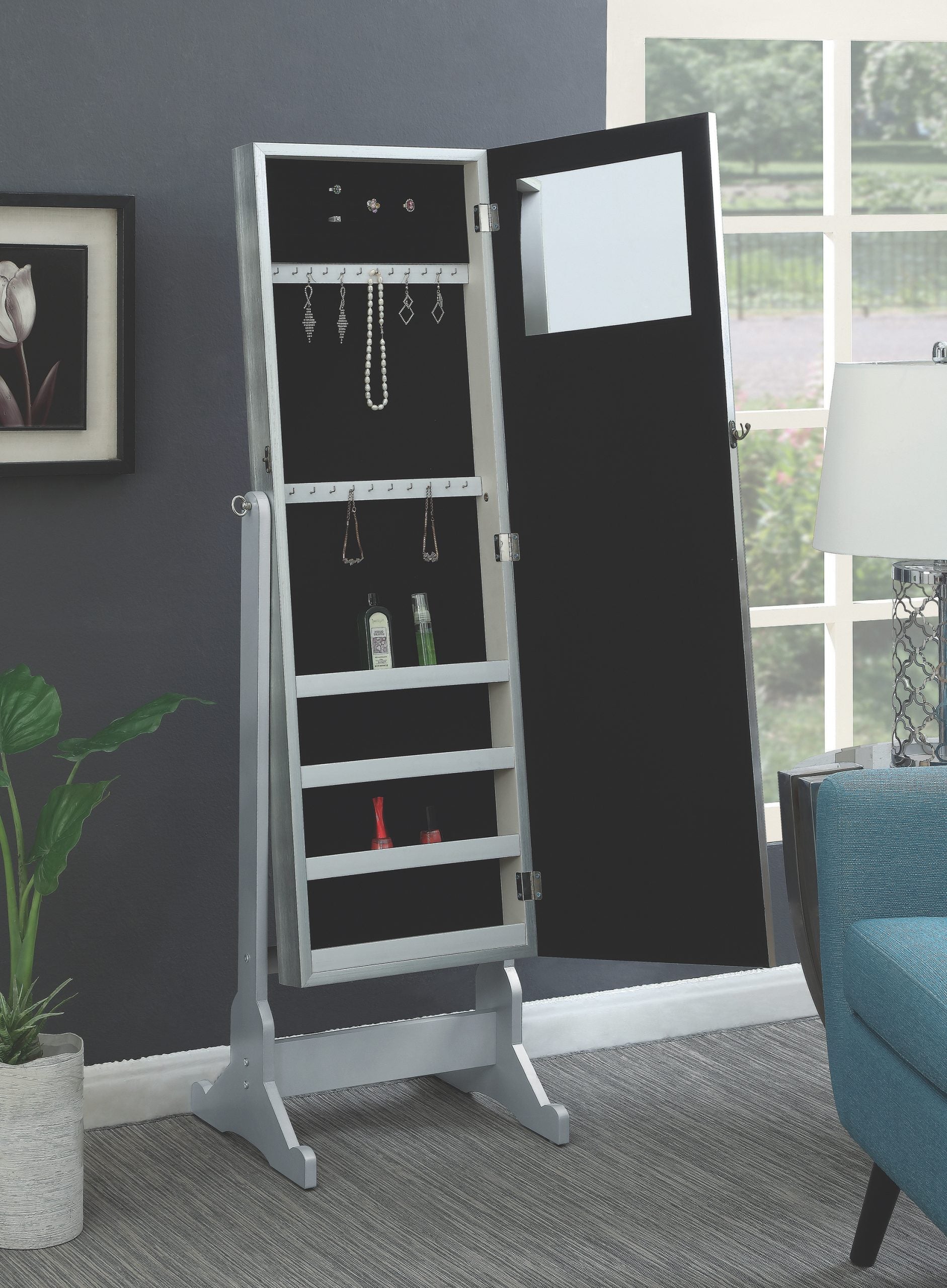 Combine beauty with function to create the perfect bedroom addition. This cheval jewelry mirror is truly an inspired choice, offering a beautiful silver finish to enliven any decor. The rectangular mirror features a lovely border sure to draw attention. Resting in a stand, the mirror tilts to create the perfect angle. Plentiful jewelry storage within makes dressing in the morning or evening a snap. SKU: 902779 NAME : Jewelry Cheval Mirror With Crytal Trim Silver