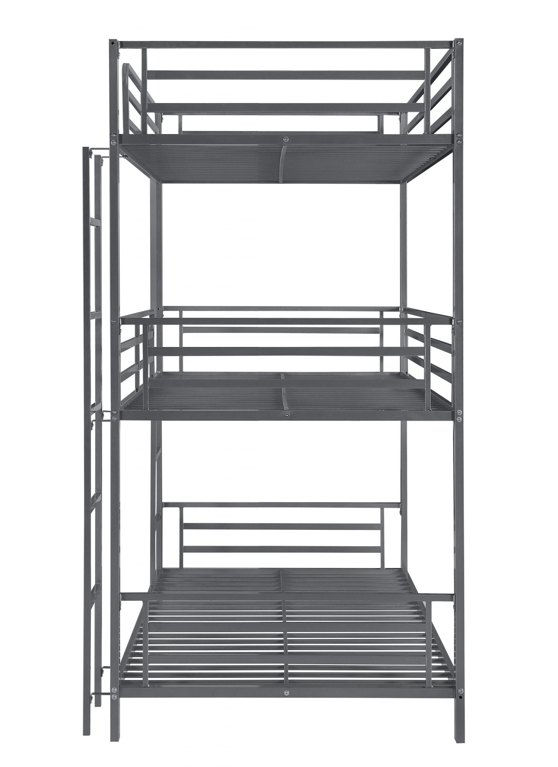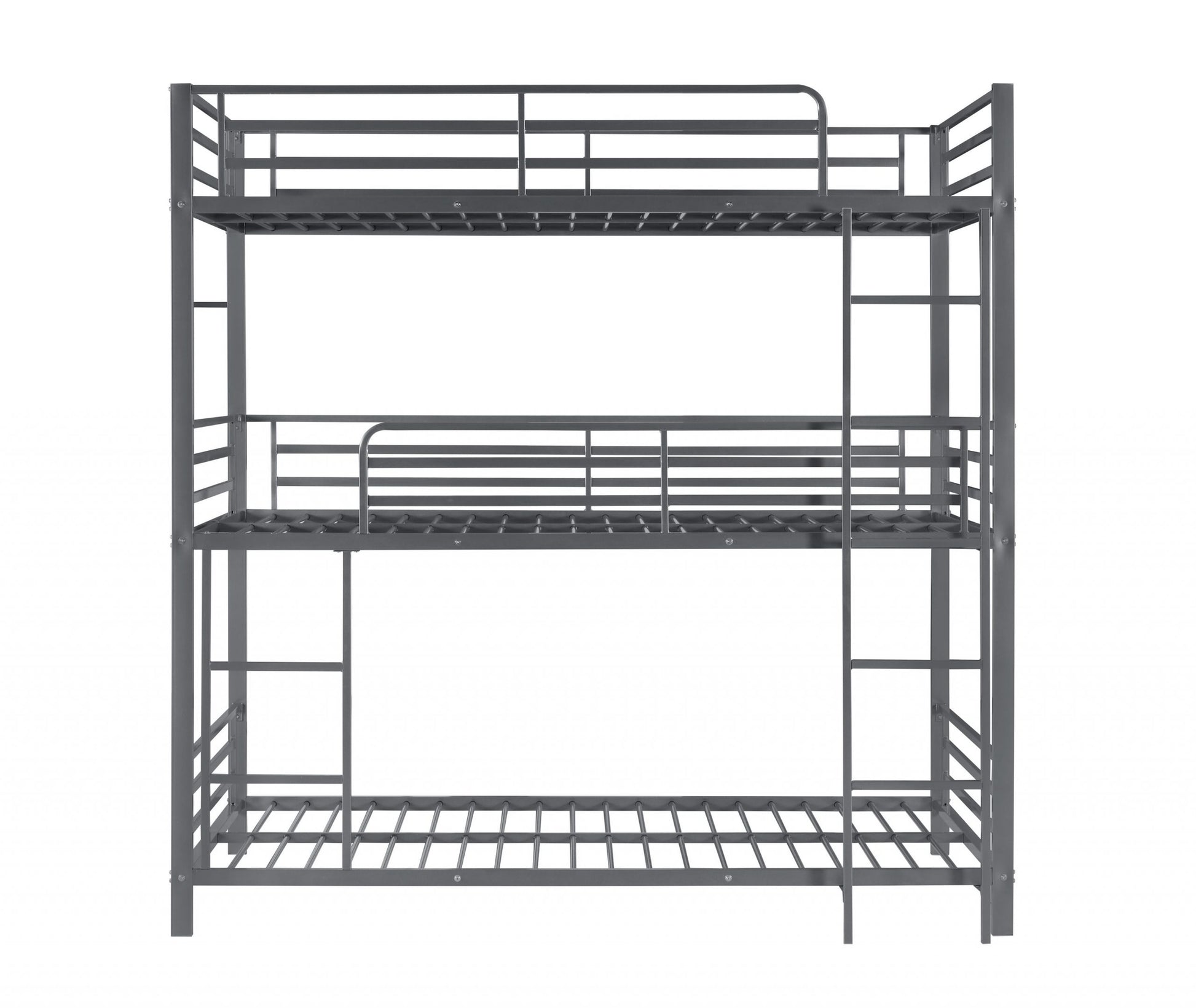 Enhance compact sleeping spaces with this three-tier bunk bed. Featuring a twin over twin over twin configuration, there is plenty of space for large families and sleepovers. This is durably crafted from metal in a striking gunpowder finish. Sturdy safety rails protect sleepers as they snooze through the night. Little ones can easily access the top bunks with built-in and secure ladders. SKU: 422670 NAME : Maynard Metal Triple Twin Bunk Bed Gunmetal
