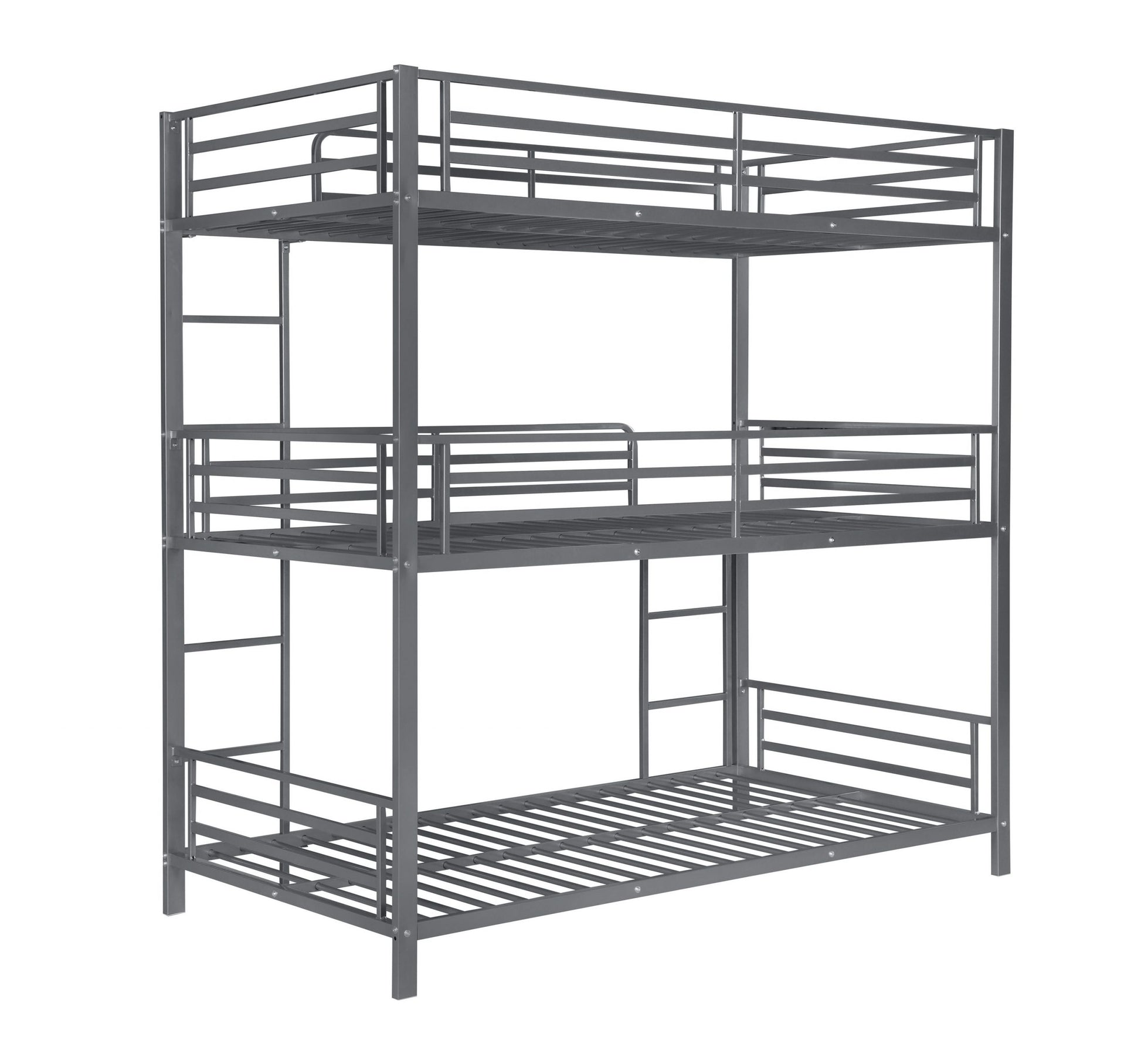 - Heavy duty metal triple bunk bed in a gunmetal powder coated finish combines a modern space-saving design with the unbridled strength of steel
