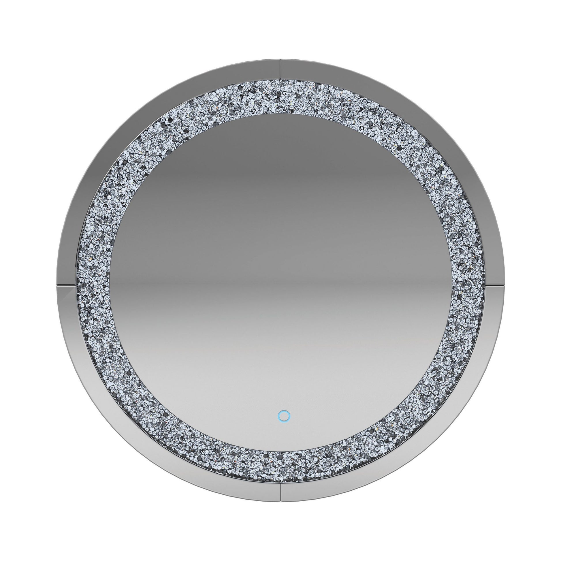 Display a contemporary aesthetic with this round wall mirror. The circular shape is less traditional, reminiscent of a porthole window. A silver frame encircles the mirror with a textured shimmer. Mount this contemporary mirror in a smaller space to instantly visually expand the room. Would also work well as a vanity mirror in a contemporary bathroom design. SKU: 961525 NAME : Round Wall Mirror Silver