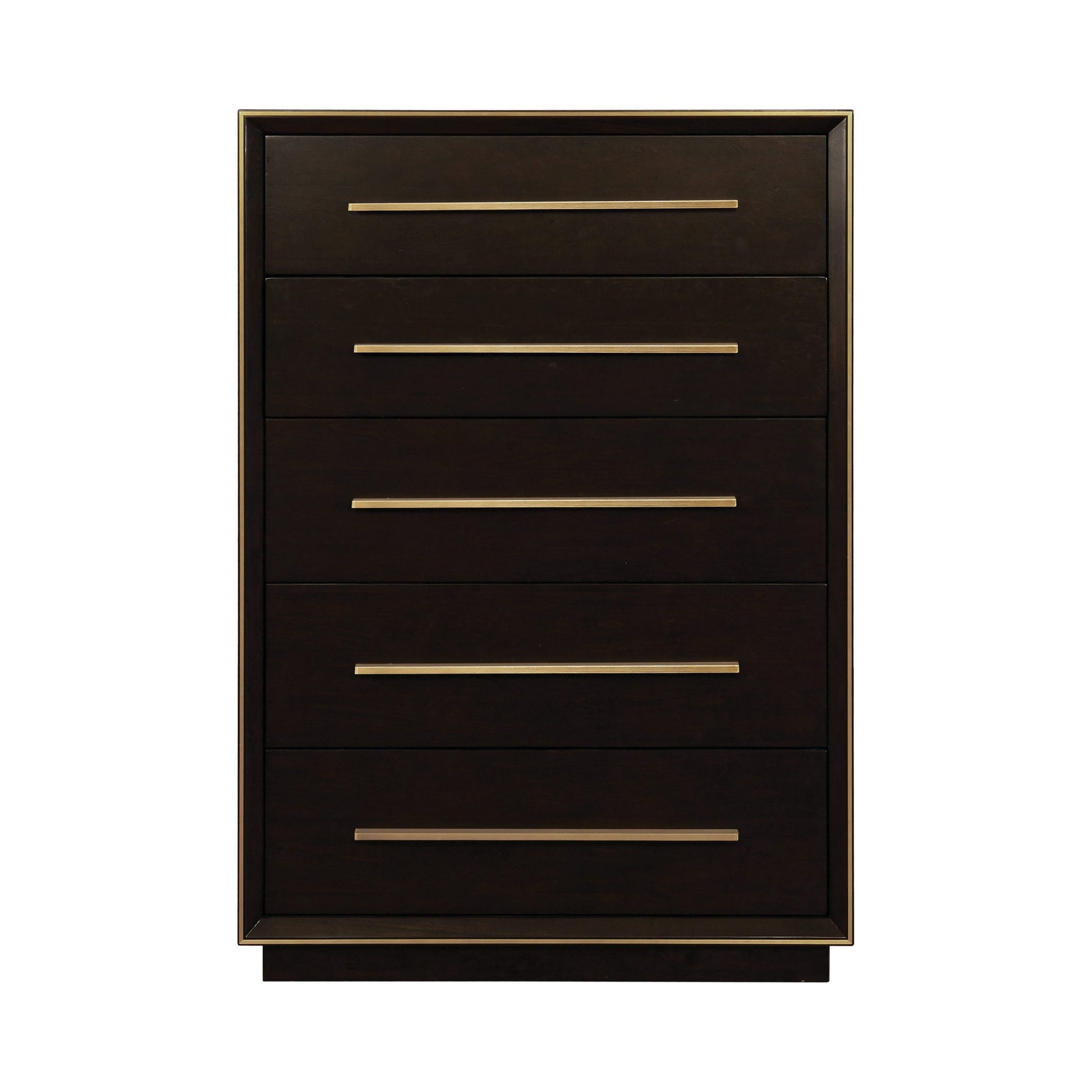With five spacious drawers, this chest is convenient and versatile. Its large size is ideal for keeping your wardrobe organized. Its strong silhouette is enhanced by an attractive, smoked peppercorn finish. Its long, sleek drawer handles and outer frame are a lovely shade of gold, giving it an eye-catching touch of glamour. With a transitional design, this chest blends seamlessly with a variety of decor styles. SKU: 223265 NAME : Durango 5-Drawer Chest Smoked Peppercorn