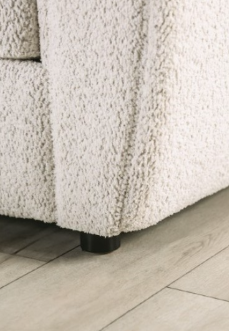This compact living room ensemble is full of welcomed surprises. The tall arms and low back is an obvious homage to the tuxedo style, but the bulbous shape and smoother lines is a unique twist taking inspiration from the modern era. Underneath the seat cushions are high density foam, making firmer seats than one would expect for the shape that it is in. Finally, soft boucle fabric wraps around the whole piece highlighting a certain air of elegance and quiet class.