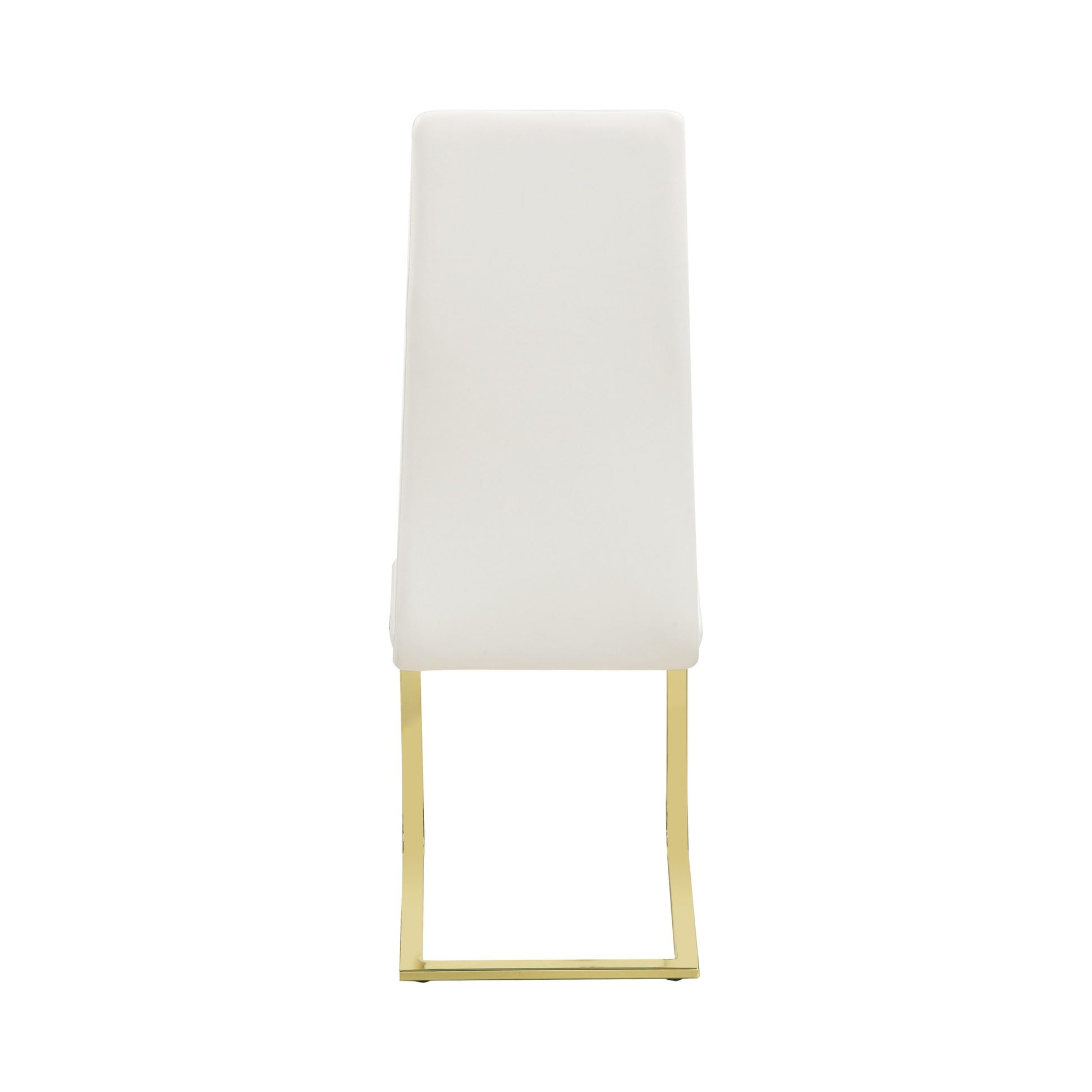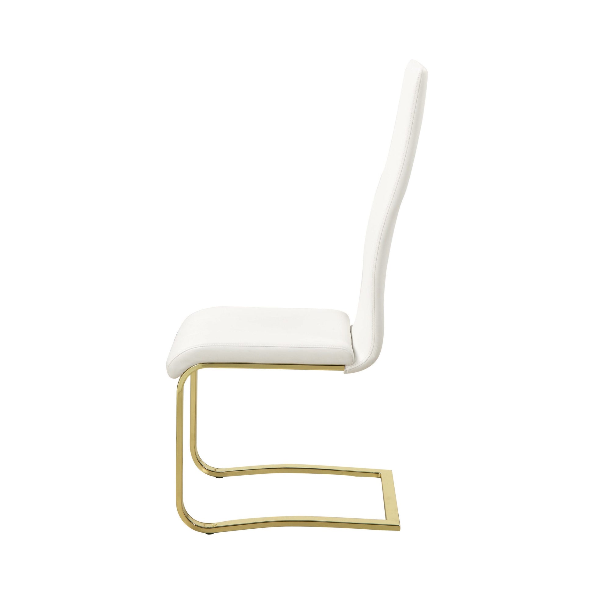 This dining chair brings a sleek, modern aesthetic to any dining space. Its cantilever design offers a floating effect, supported by sturdy gold electroplated metal legs for a luxurious touch. Upholstered in smooth white faux leather, the high backrest and padded seat provide superior comfort and style. The gently contoured shape enhances ergonomic support, making this chair a perfect choice for contemporary interiors. Designed for both elegance and durability, itβs a stunning addition to any dining setting.
