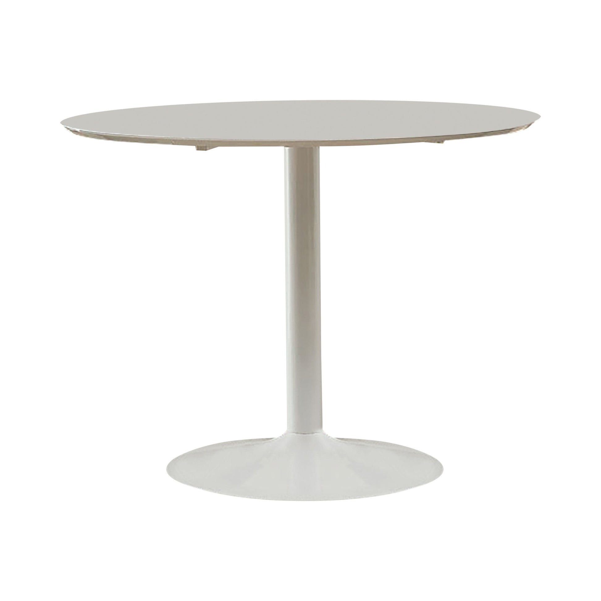 Clean, modern lines meet retro charm in this round dining table. A smooth white painted top rests on a sleek pedestal base, all finished in a glossy white powder coating for a unified and fresh look. Ideal for casual dining spaces or cozy kitchen nooks, this table comfortably seats four and provides a bright, minimalist centerpiece that pairs effortlessly with a variety of dining chairs.