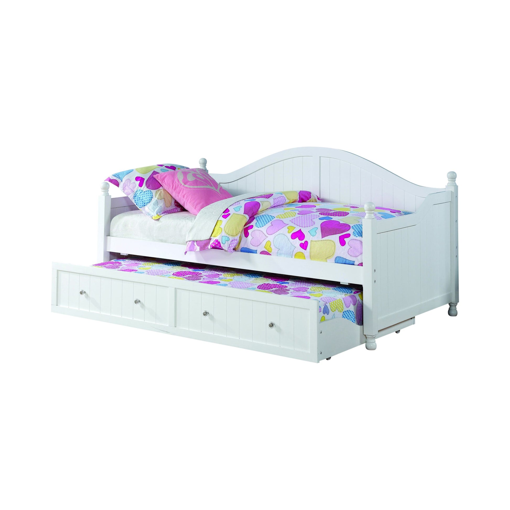 Every bedroom needs a refresher at some point. Lighten the mood in yours with this stylish daybed with trundle. Perfect for a compact space, it offers comfortable sleeping and sitting with an underbed slide-out mattress for an additional guest. An elegant curved back sets the stage for a charming silhouette, while a bright white finish and crystal knob pulls enhance its romantic personality. This daybed grows with a child into teen years. SKU: 300053 NAME: Twin Daybed With Trundle White