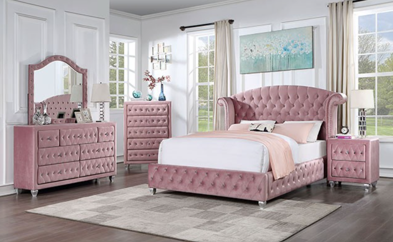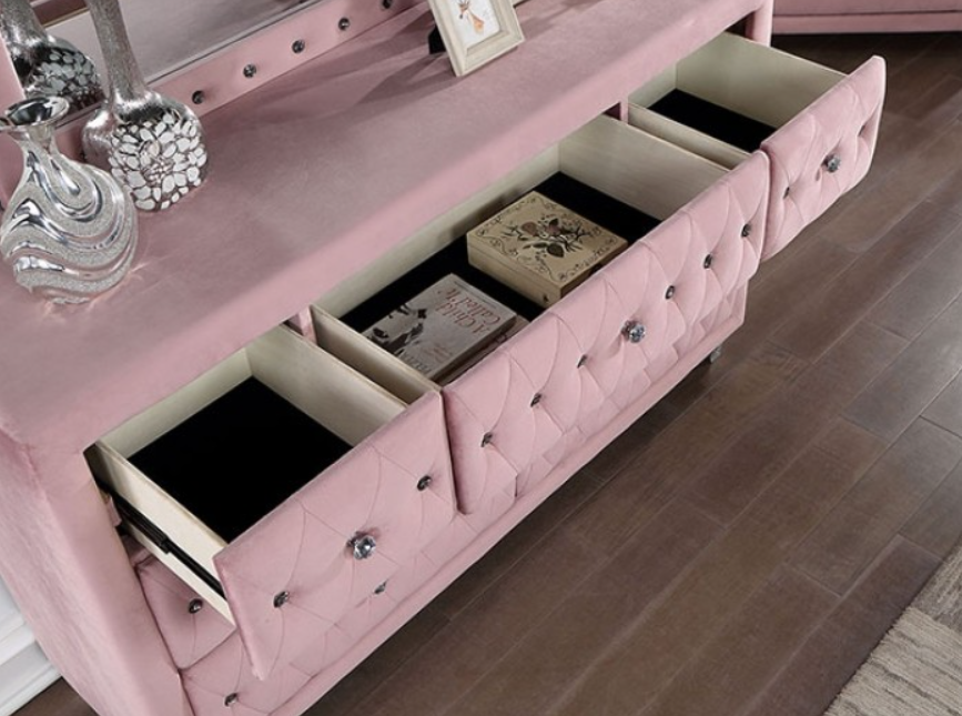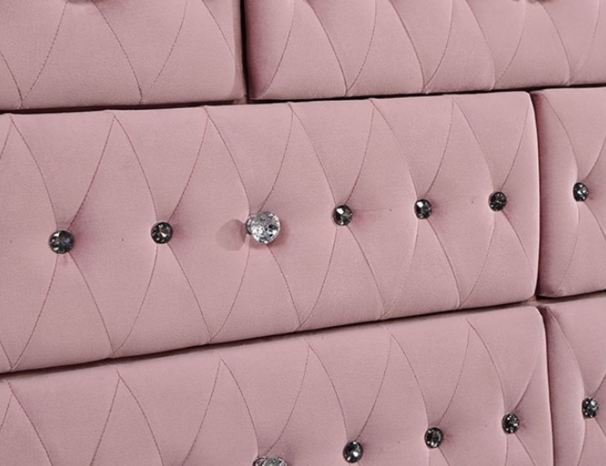 Showcase your personal taste with this bold statement piece in your bedroom. Fully upholstered in flannelette, this dresser features eye-catching tufting. The padded fabric and crystal buttons continue all throughout the drawers. Each drawer handle is made of glistening acrylic crystals, while silver-painted cabriole legs are perfect in bringing in majestic vibes.